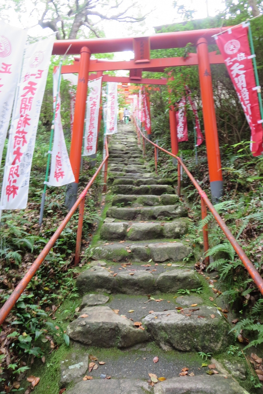 学問の神様である太宰府天満宮の本殿横を通り過ぎ、梅園を抜けて、さらに進むと朱色の鳥居と幟が見えてきます。ここから少しずつ階... 続きを読む段を上ると稲荷神社らしくなり、朱色の鳥居が連続して現れてきます。太宰府天満宮の境内は年中参拝客が絶えませんが、この辺りになるとずいぶん訪れる人が減ってきます。最初の鳥居を過ぎて左に行くと徐々に階段の勾配が増します。最後は幅のあまりない石段を一気に登ると本殿にたどり着きます。食物、とくに稲の生長を守護する神様が祀られています。五穀豊穣・商工業発展、開運と幸福をもたらす神だそうです。お参りの作法は手前の12個ある鈴から自分の干支の鈴を見つけて鳴らし、その後に奥の大きな鈴を鳴らしてからお参りするようになっています。本殿の左にはさらに少し上がる階段があるので上って行くと小さな石室があります。ここが奥之院というところになります。 閉じる
