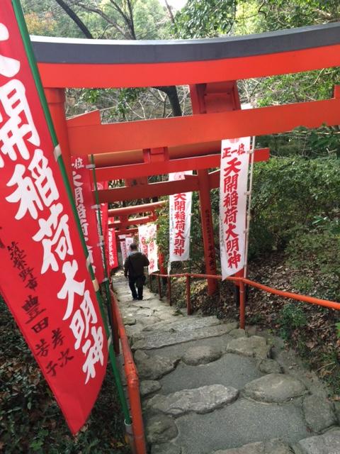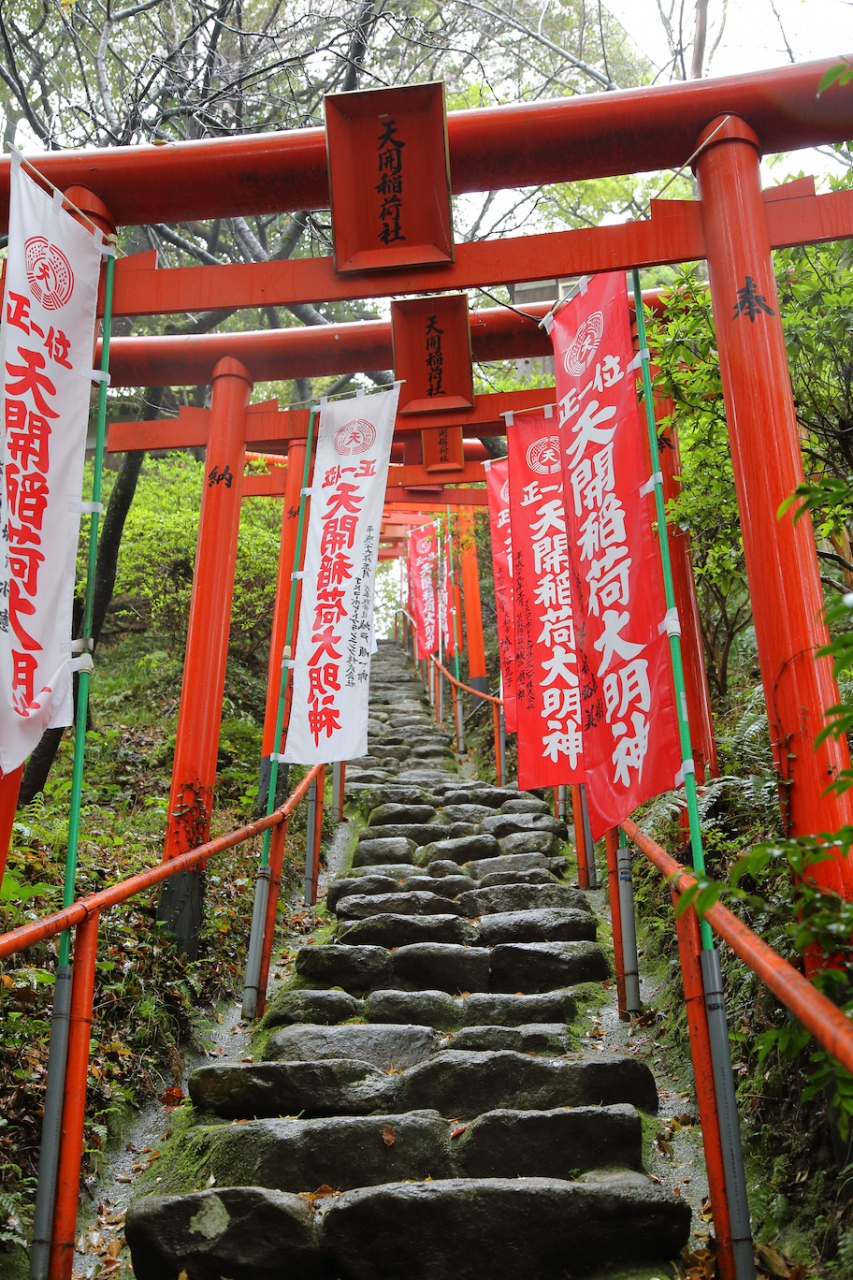 天満宮北側の梅園を抜けると、松島茶屋やお石茶屋に面して石段が整備されています。その石段を登っていくと広場があり、そちらから天開稲荷社の鳥居が続いています。鳥居に従って上っていくと、天開稲荷社の拝殿に着けます。なお、階段は狭く、結構急ですので気をつけてください。なお、途中にあるトンネルを抜けると県道578号に出られます。