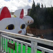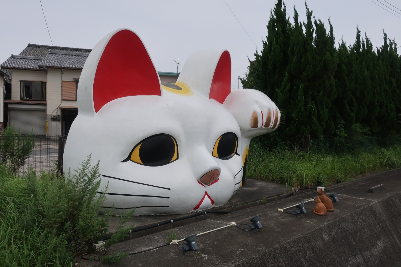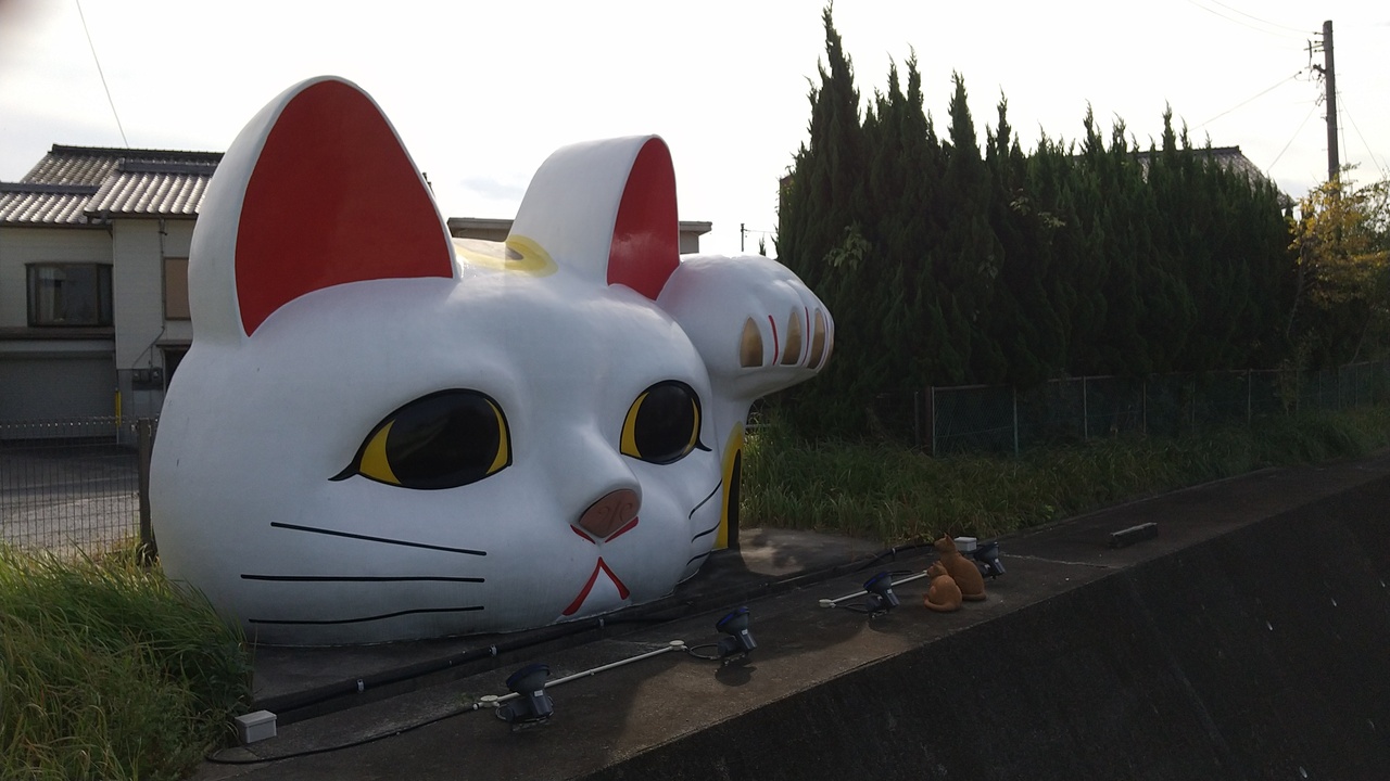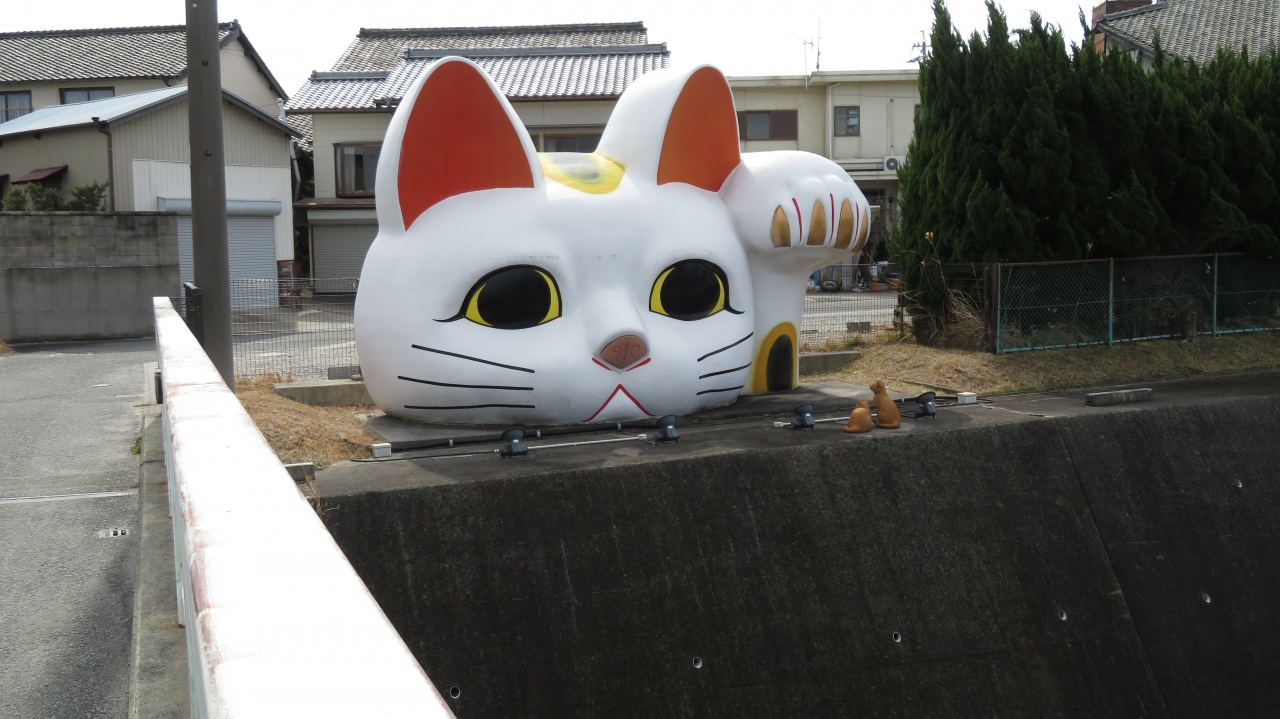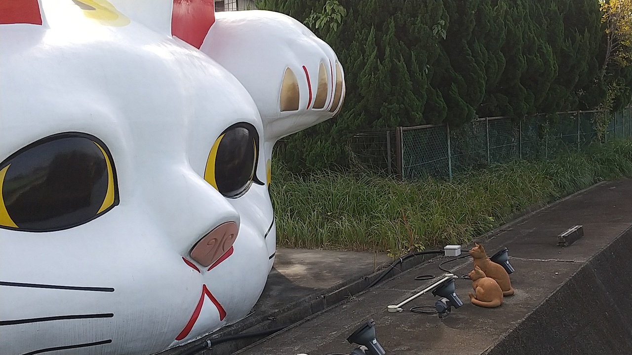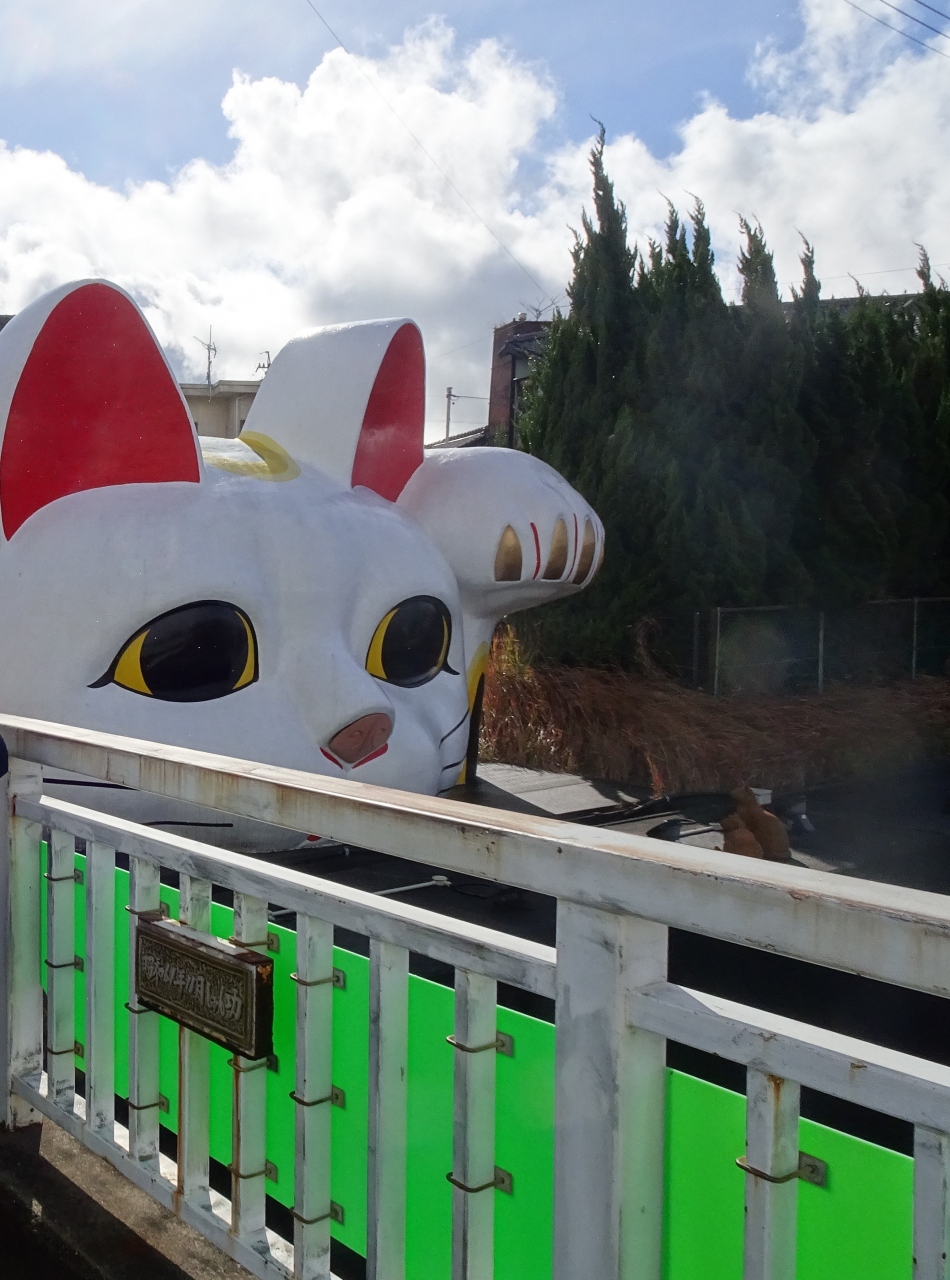 歩道橋の上にいる常滑名物の招き猫。ややハリボテ感有(笑)