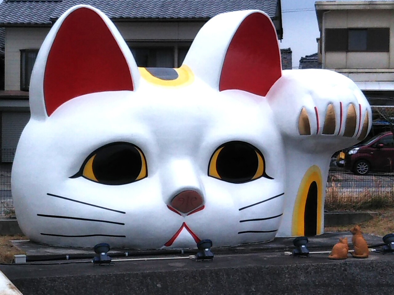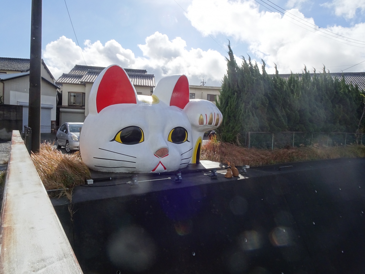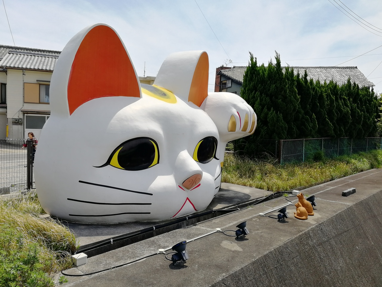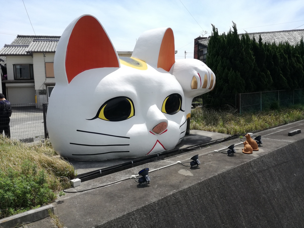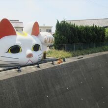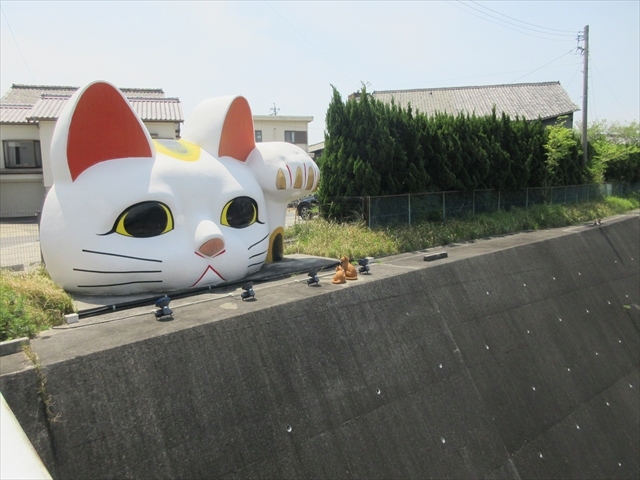 歩道橋の上にいる常滑名物の招き猫。ややハリボテ感有(笑)