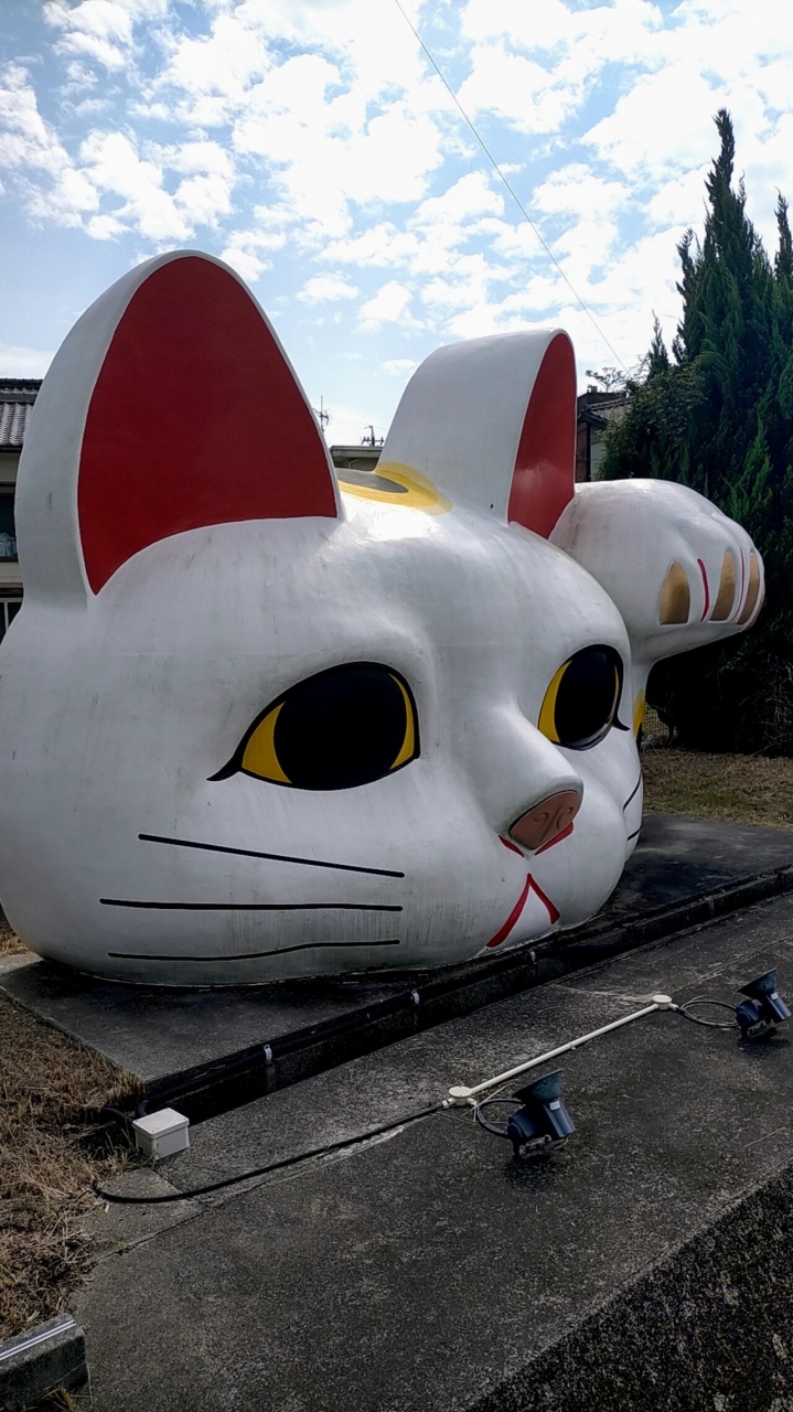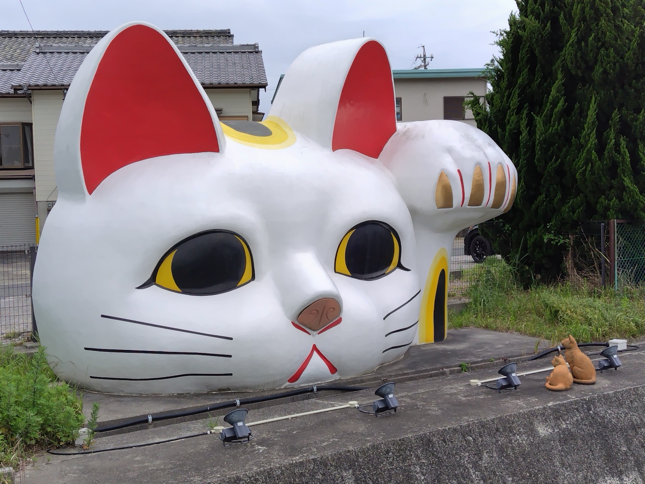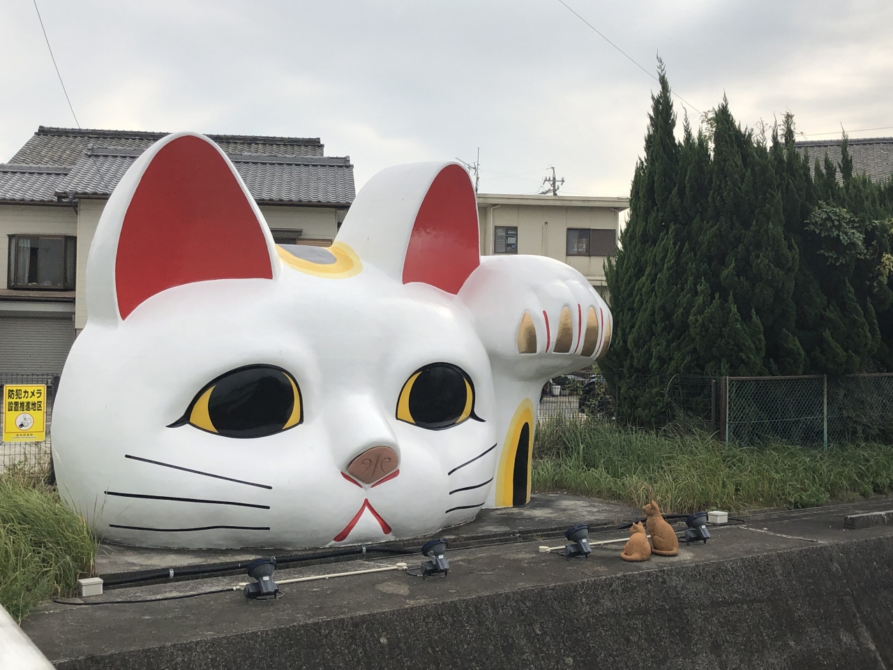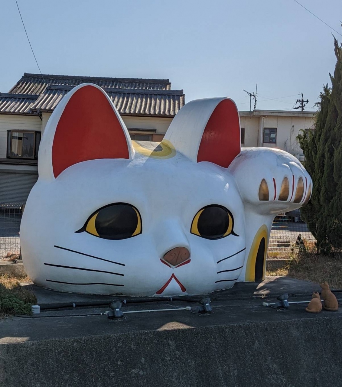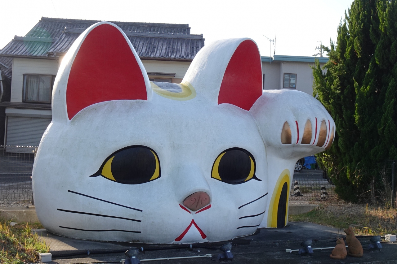 歩道橋の上にいる常滑名物の招き猫。ややハリボテ感有(笑)