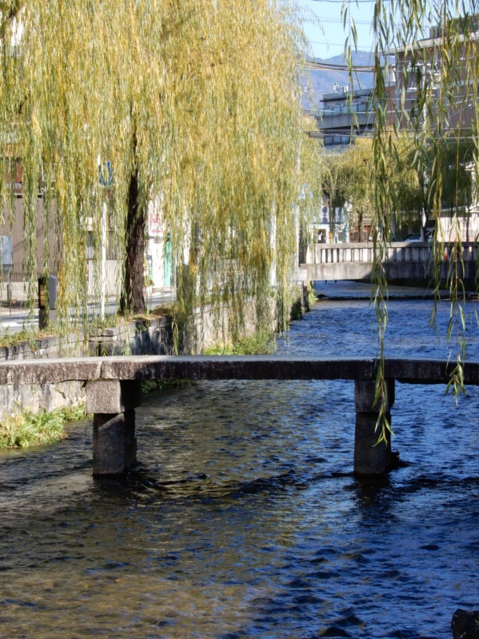 水がきれいな川で、ところどころに昔ながらの石橋があり、川岸に柳が生えているイメージです。