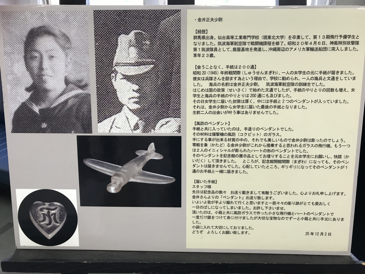 享年23歳で特攻した少尉から女学生への最後の贈り物は、この手彫りのペンダントだったそうです。これから自分が搭乗すると思われるゼロ戦をかたどった飛行機と、2人のイニシャルが彫られたハート形のペンダントに言葉に詰まります。