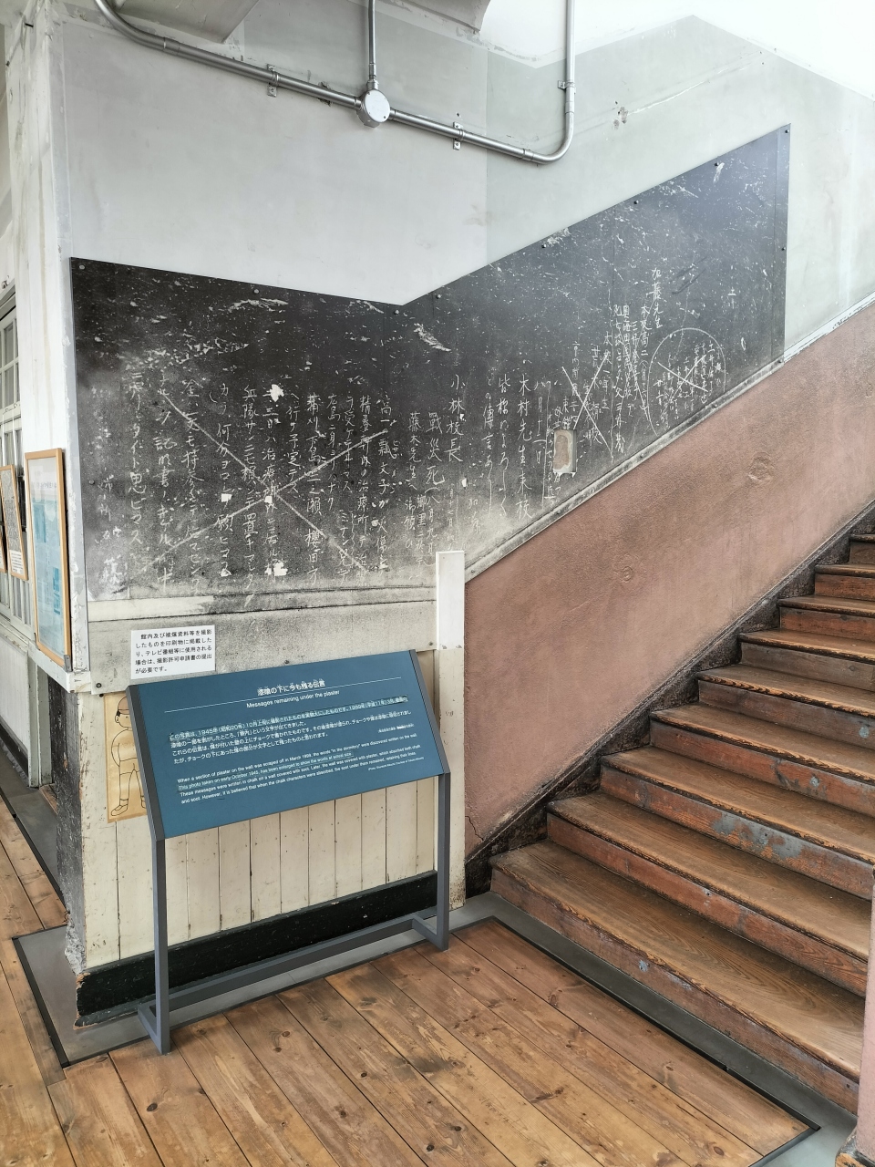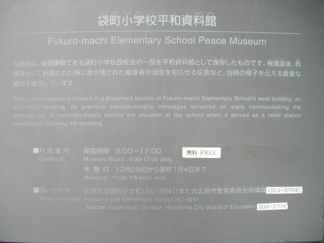 広島市中心部の繁華街を散歩していて、袋町小学校平和資料館という看板を見つけました。こんなところに、原爆がらみの資料館があ... 続きを読むったかなと思って、入ってみました。そこは、原爆の爆心から数百メートルの小学校があり、戦後も小学校として使われていた場所でした。20年ほど前、建て替えの際、被爆建物として一部が資料館として残され、被爆当時、救護所などとして使われた際、壁に書かれた伝言が見つかり、復元されていました。この辺りは爆心からかなり近く、全滅したと思っていましたが、たまたま建物内にいた3人の生徒が生きていたことが記されていました。この事実はちょっとびっくり。もっとも、市内は原発の中のような、とんでもないレベルの放射能に汚染されており、3人がどのようなその後をおくったのか気になりました。