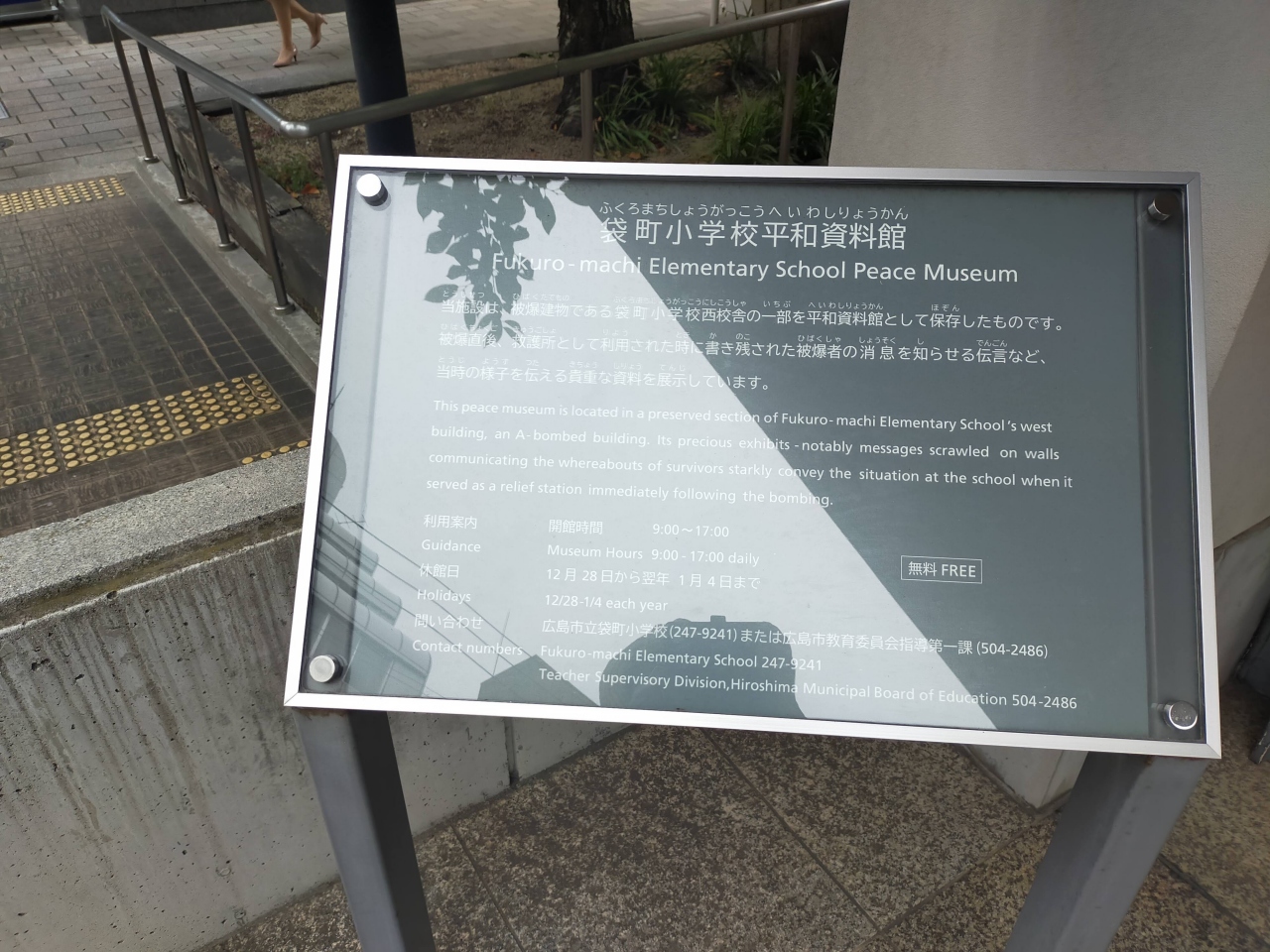 爆心地から460m 1873年(明治6年)就将館として開校 開校から何度も名前を変えている学校ですが、原爆投下... 続きを読む時の名は「袋町国民学校」 鉄筋コンクリート造3階建の校舎は、原爆によって外形だけ残して焼失しました。焼け残った校舎は、避難場所や救護所として使用され、児童・教職員や地域の人々の安否を尋ねる場となった。 広島市公式ホームページより 黒く焼けた壁は行方不明者を探すための掲示板 この学校は爆心地に最も近い学校の1つで、約160人の生徒と教師が巻き込まれ、建物は大きな被害を受けました。 1937年(昭和12年)に現存する校舎の西側に増築された鉄筋コンクリートの建物が残り、現在は平和資料館として無料で見学させて貰えるという事だったので伺ってみました。 原子爆弾が投下されたのは8時15分 子供たちが登校している時間です。 何とも言えない気持ちになりました。 被害に遭われた方々にご冥福をお祈りいたします。 閉じる