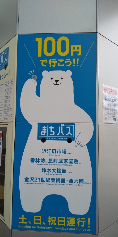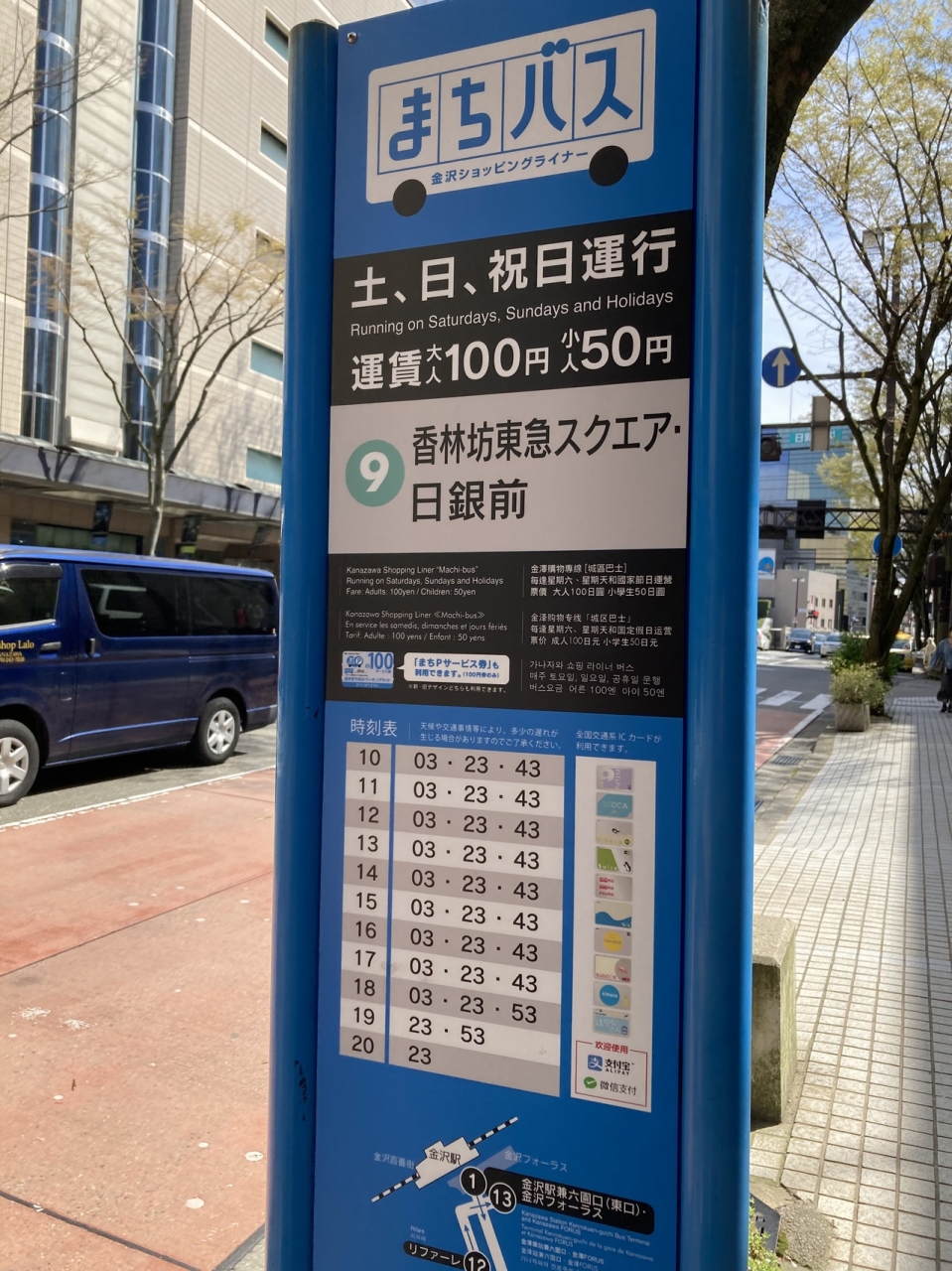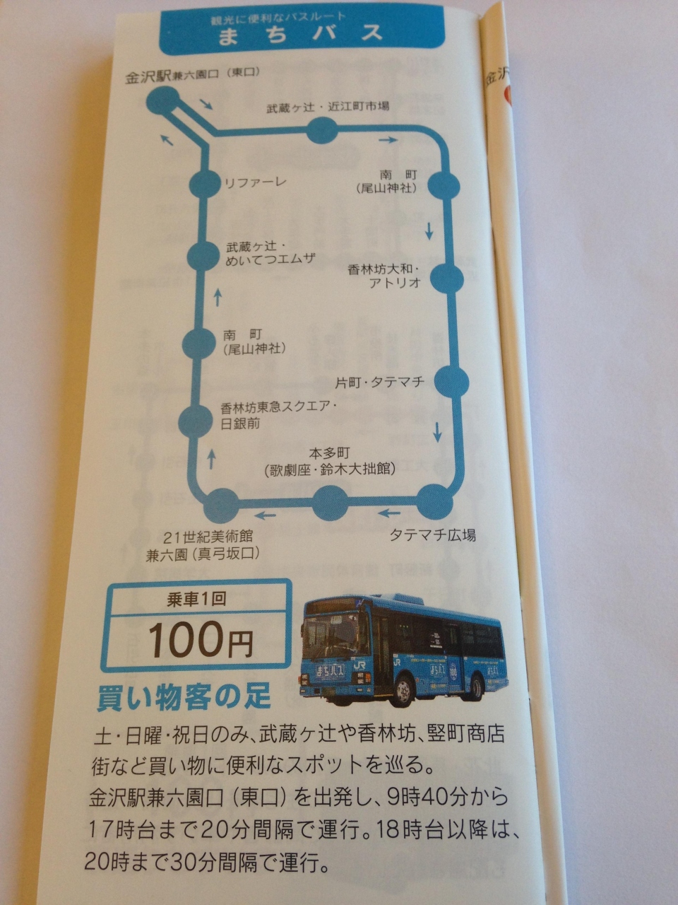 市内をいろいろ乗り降りするなら北陸交通路線バスと城下町金沢周遊バスを一日乗車券で使うのがお薦めですが、一日乗車券を利用するほどでなく香林坊までお買い物だけなら、まちバスが来たらラッキーと100円で乗るのがいいですね。100円節約のために20分も待つことはないと思います。