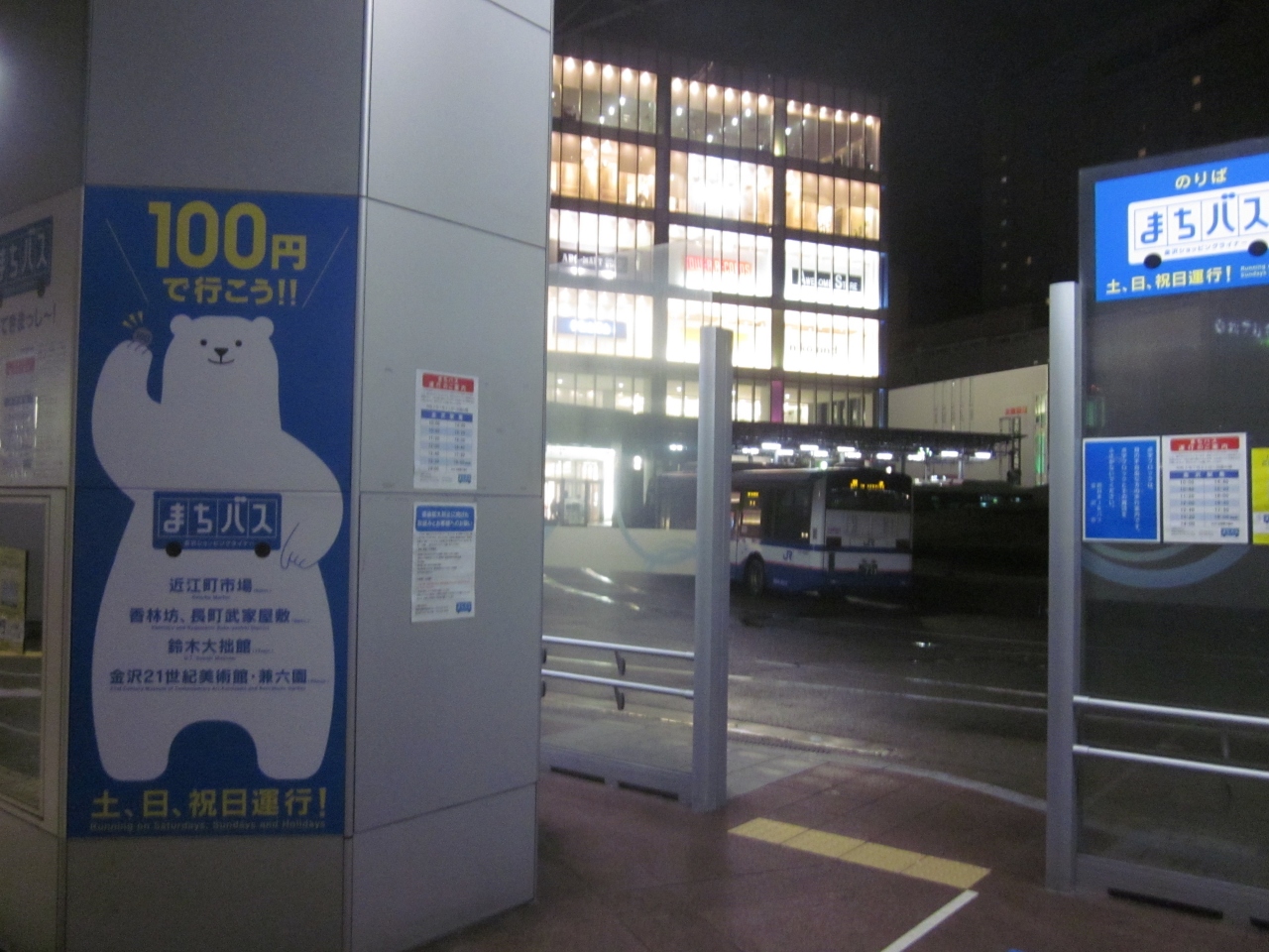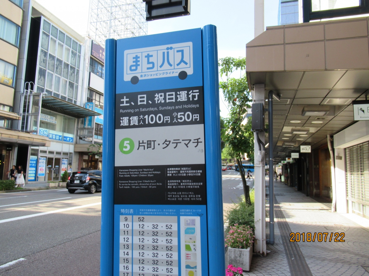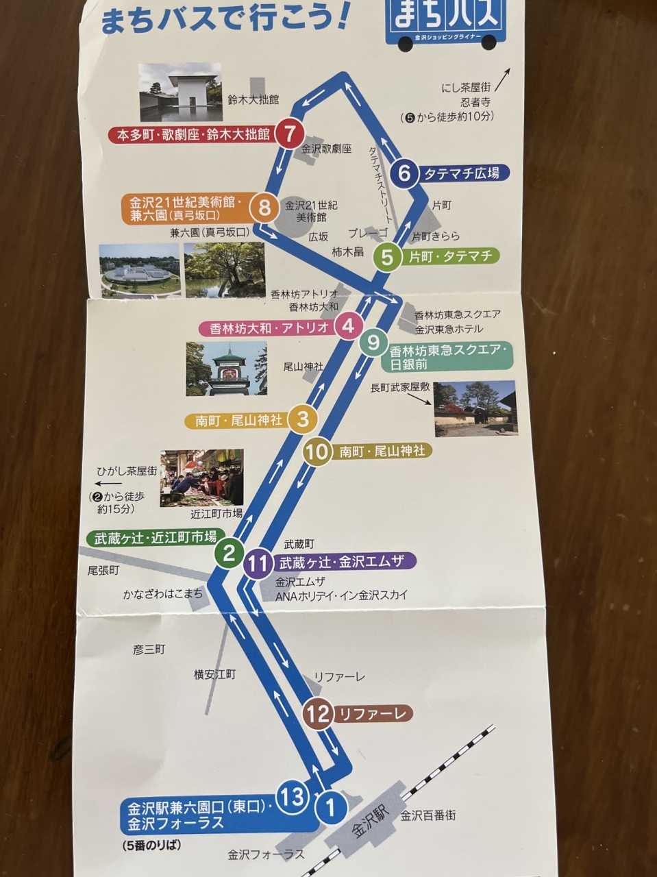 市内をいろいろ乗り降りするなら北陸交通路線バスと城下町金沢周遊バスを一日乗車券で使うのがお薦めですが、一日乗車券を利用するほどでなく香林坊までお買い物だけなら、まちバスが来たらラッキーと100円で乗るのがいいですね。100円節約のために20分も待つことはないと思います。
