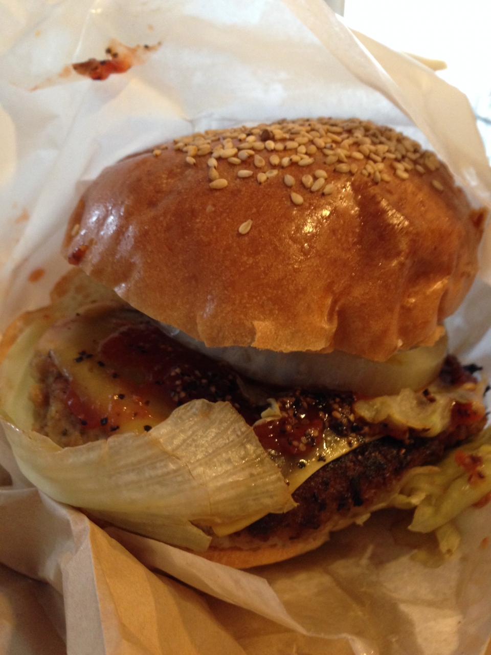 ソイミートチーズバーガー780円と、チョコレートケーキ480円を購入。バーガーには分厚く切った玉ねぎがゴロゴロ入っていました。ソイミート、最近ニクニクしいジューシーな肉が苦手になってきたので、私はありでした。チョコレートケーキは味に特徴はないのですが、大きい。食後のデザートとして食べるには大きすぎるので半分くらいで丁度よかった。