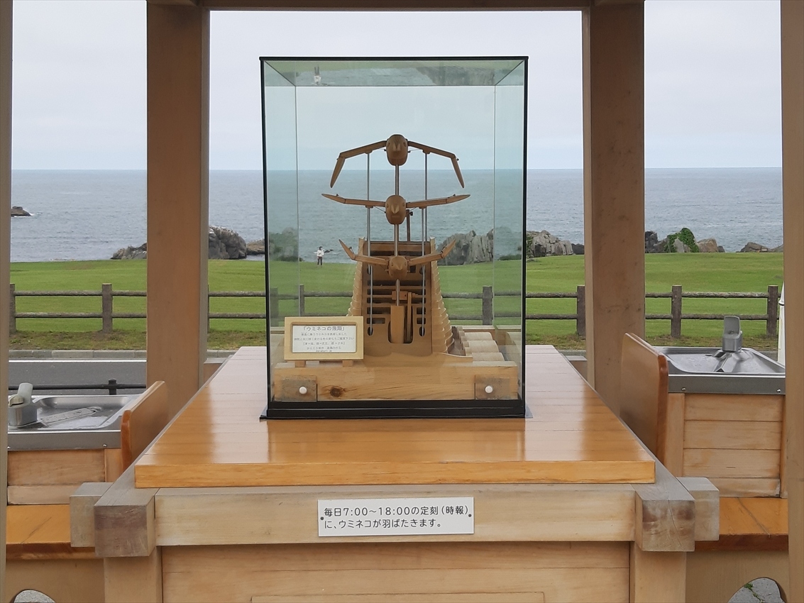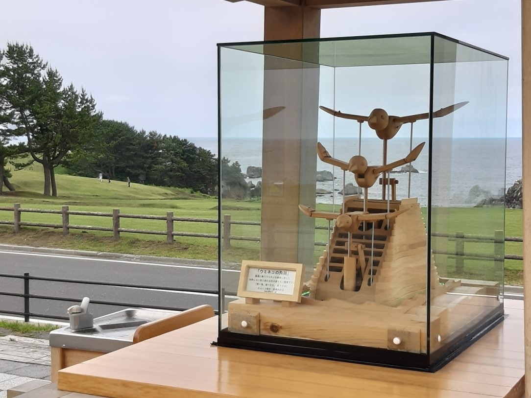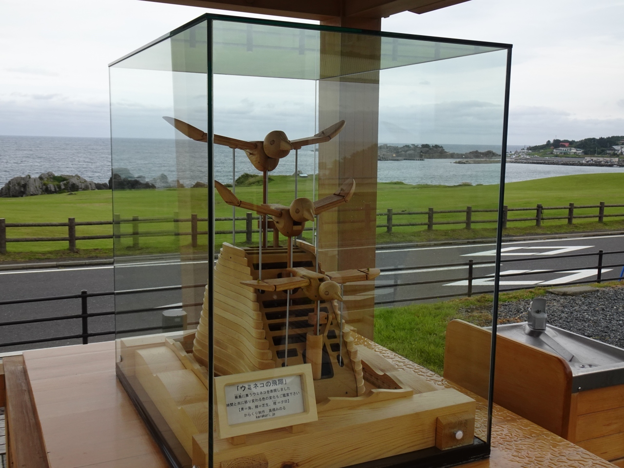 建物外には≪ウミネコ飛翔・水飲み場≫があり、三羽のウミネコ型の木工品が置かれていますが、これは毎日7:00~18:00の毎正時に、八戸市市制施行80周年のイメージソング『目をつむれば』という曲に合わせて動く仕掛けになっています。