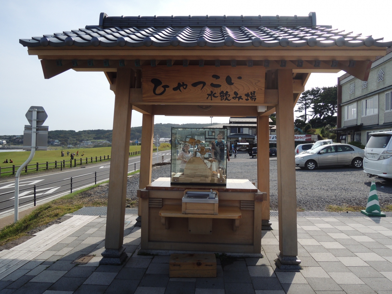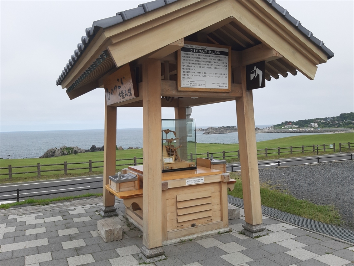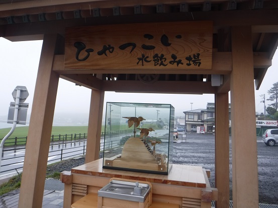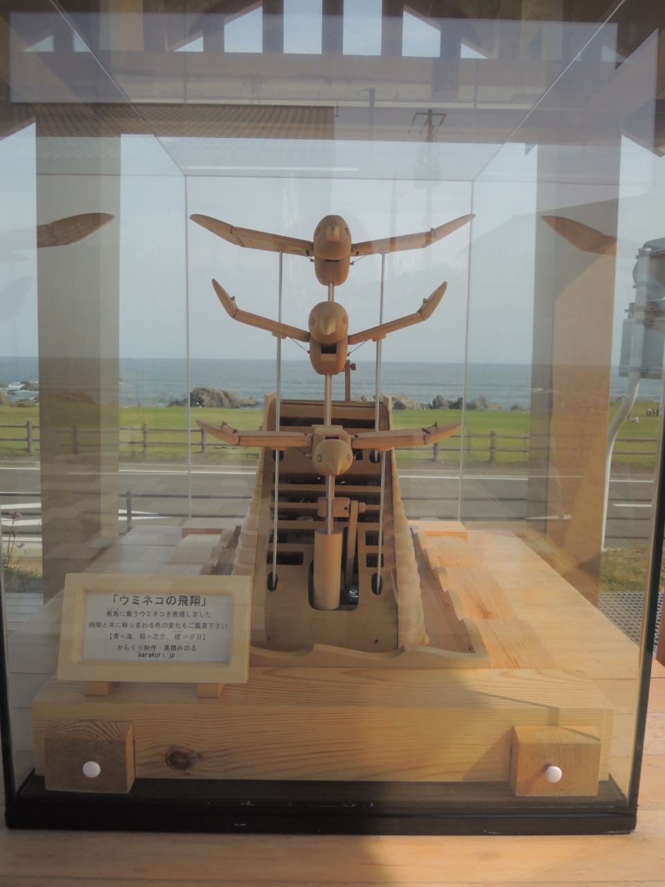 建物外には≪ウミネコ飛翔・水飲み場≫があり、三羽のウミネコ型の木工品が置かれていますが、これは毎日7:00~18:00の毎正時に、八戸市市制施行80周年のイメージソング『目をつむれば』という曲に合わせて動く仕掛けになっています。