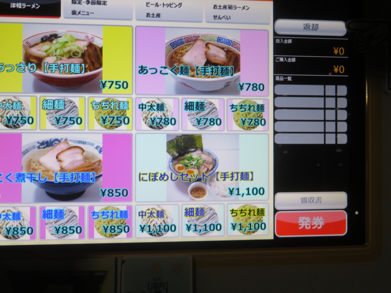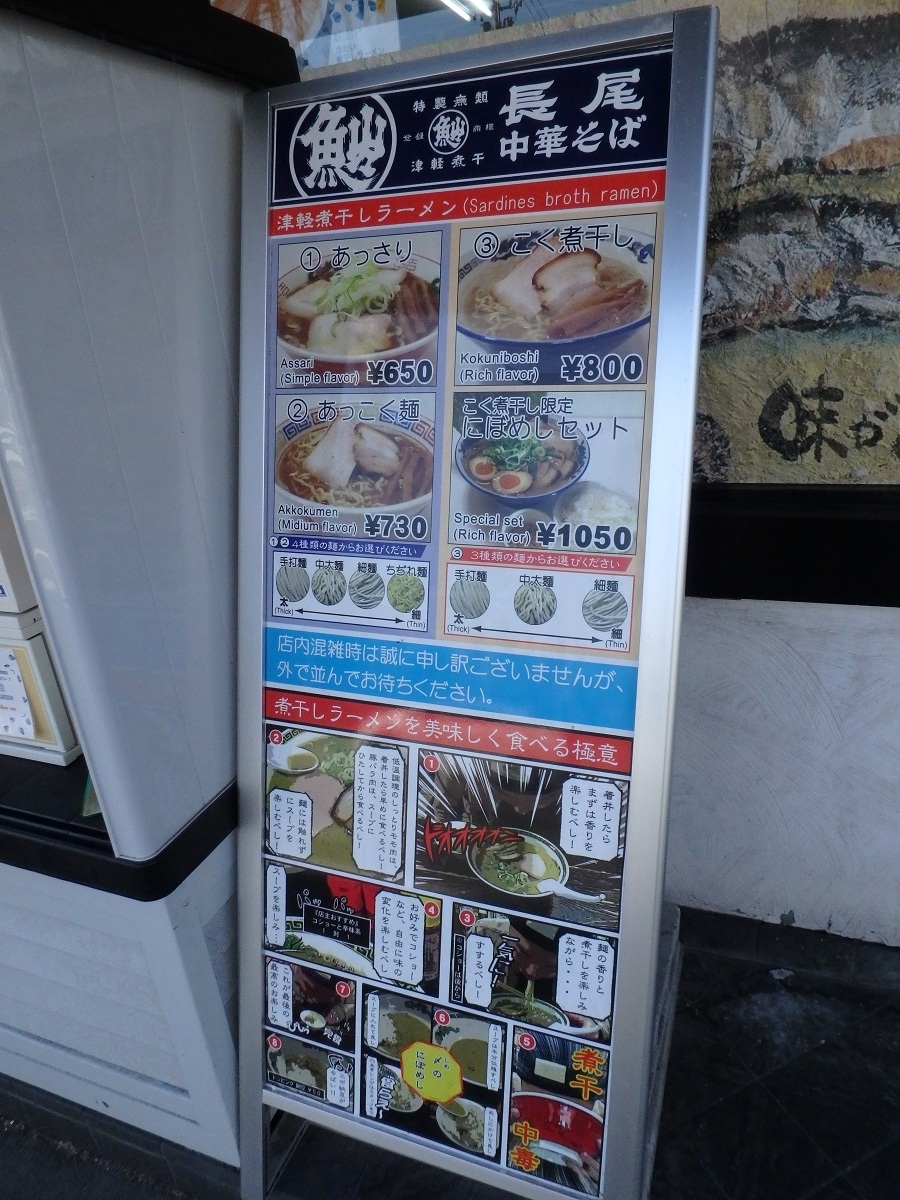 メニューはあっさり、こく煮干し、あっこく麺から選べます。麺も手打麺、中太麺、細麺、ちぢれ麺の4種類から選びます。首都圏で提供される濃いめの煮干しスープに閉口していた私はあっさりを選択、あとは「普通」と言っておいたのでたぶん手打麺ではなかったでしょうか。