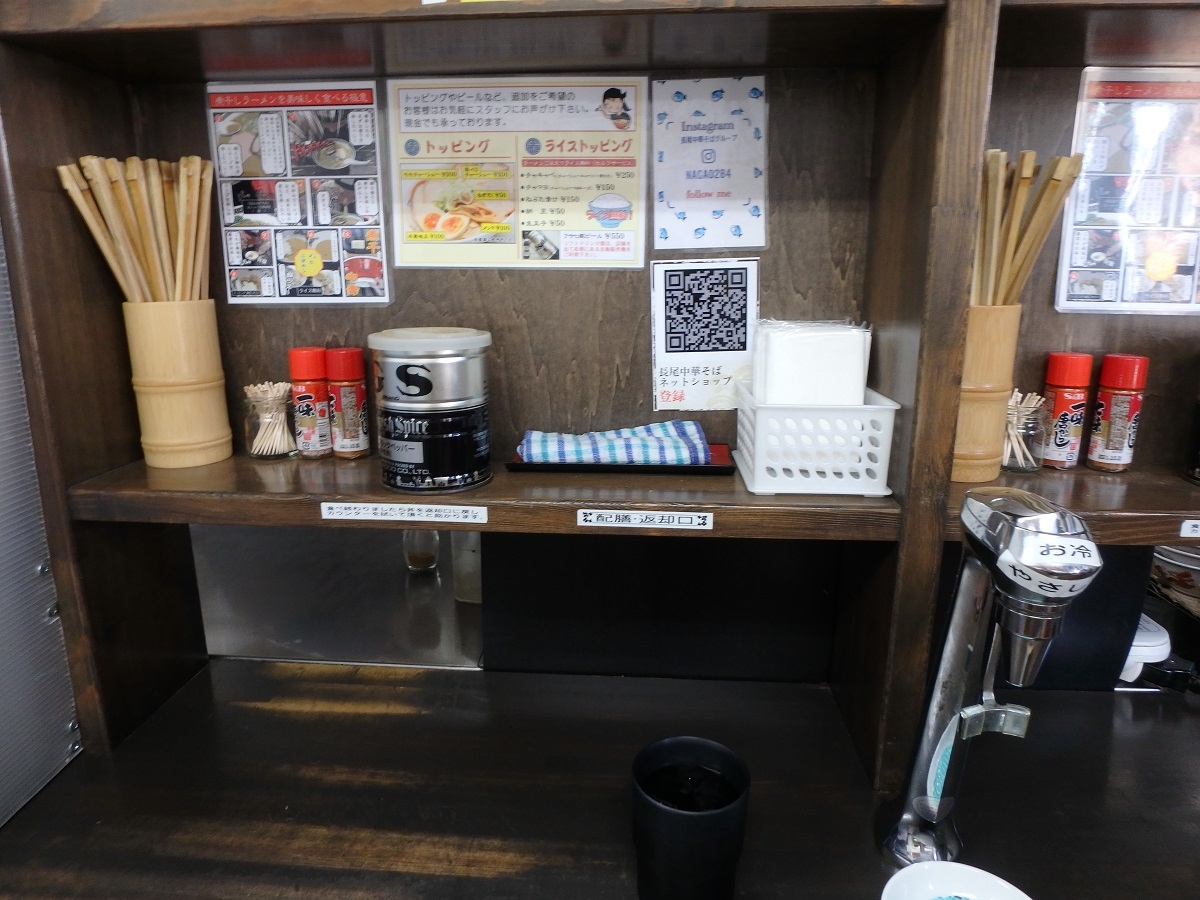 長尾中華そばは、あっさりとした煮干しラーメンの概念を打ち破る「新・津軽ラーメン」という濃厚な煮干しラーメンという新たなジャンル(お店曰く)のお店。店内は、カウンター席のみで、お水、ライス(ラーメンを頼むとライスは食べ放題という嬉しいサービス)セルフ。お店に入ると煮干しの香りが充満しており、煮干しラーメンを期待させます。