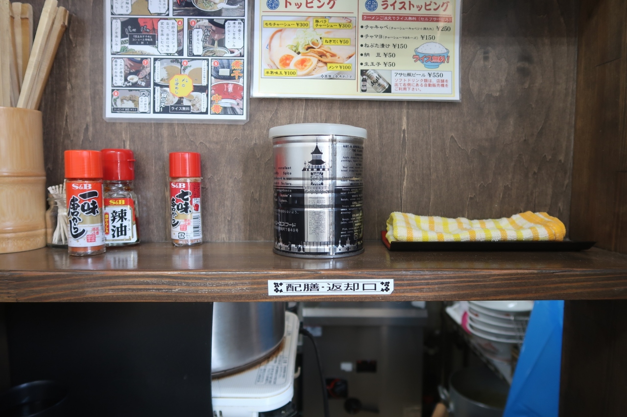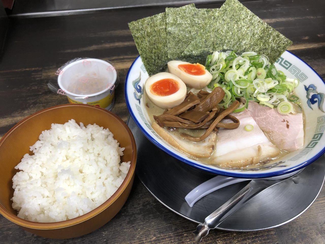 駅近くの煮干し系ラーメン店。白ご飯はセルフ無料。