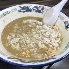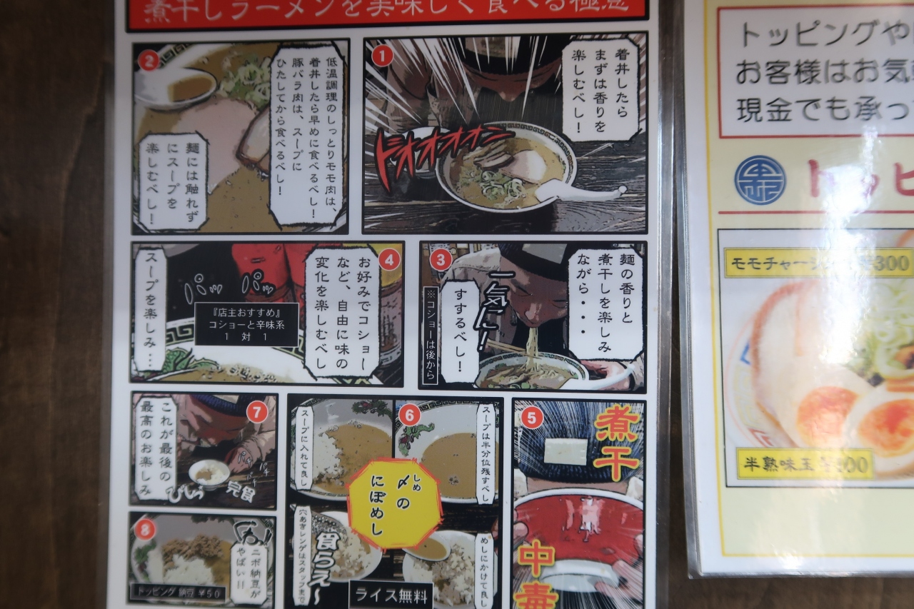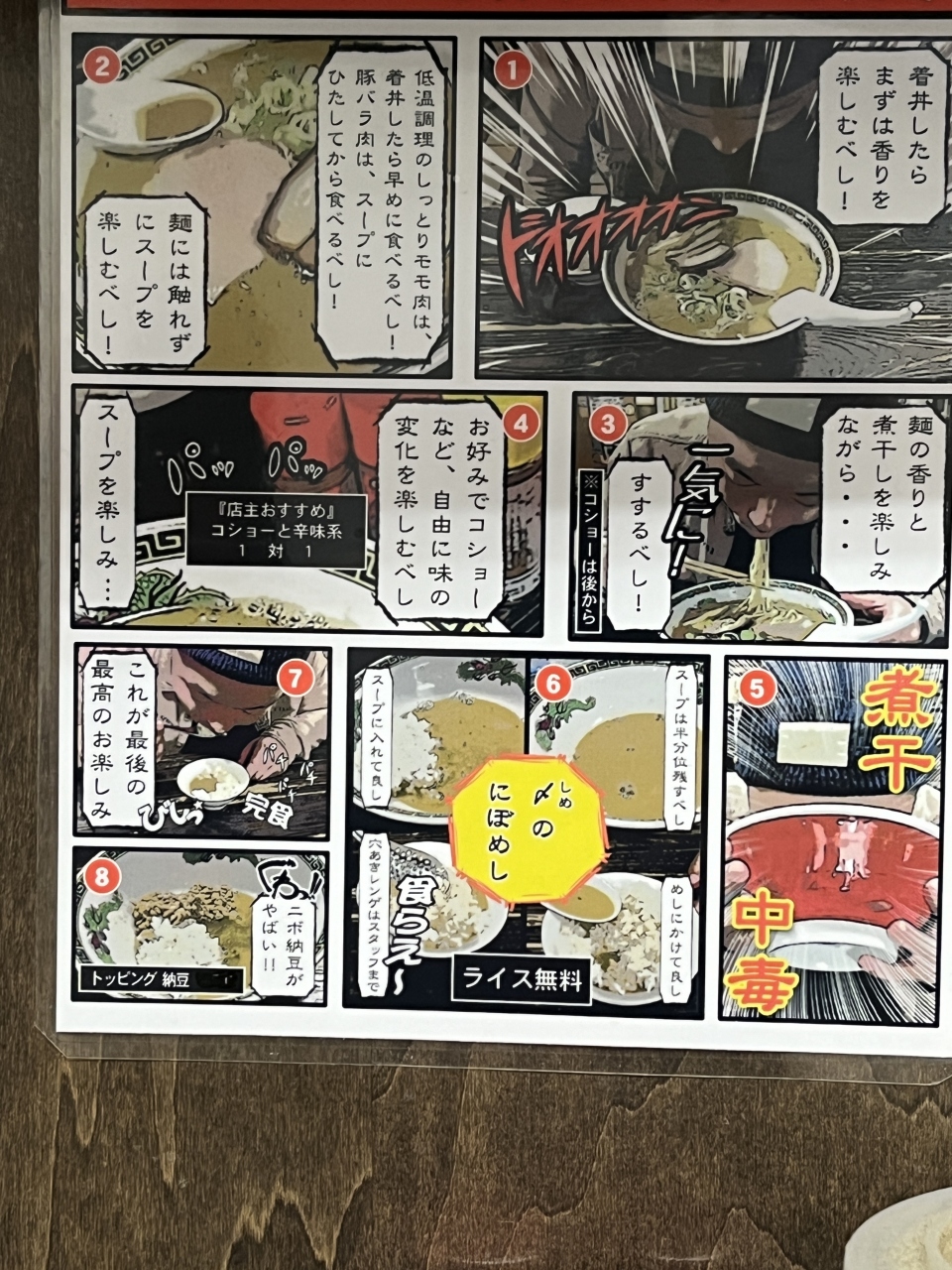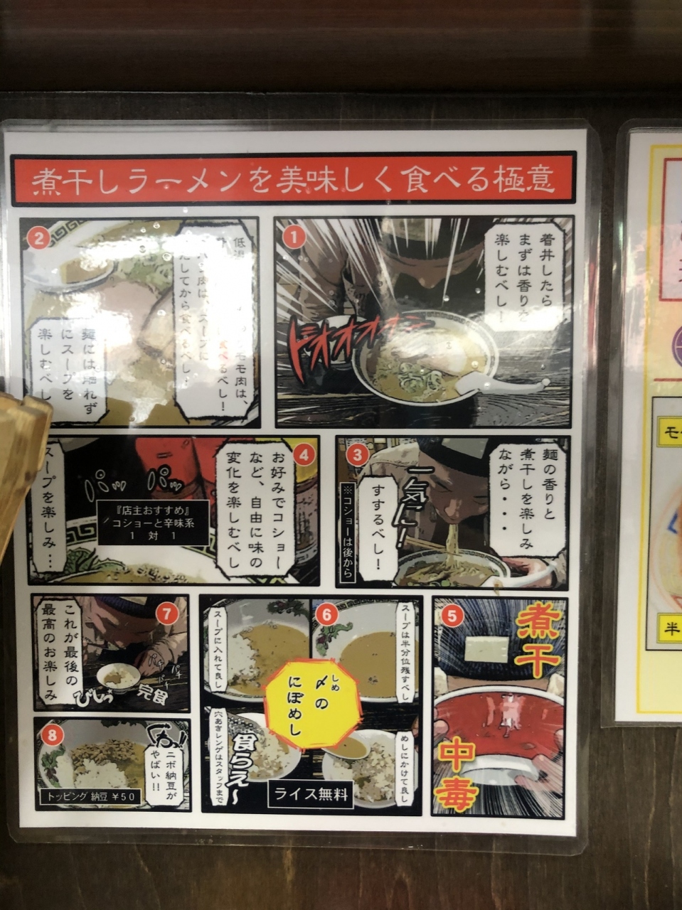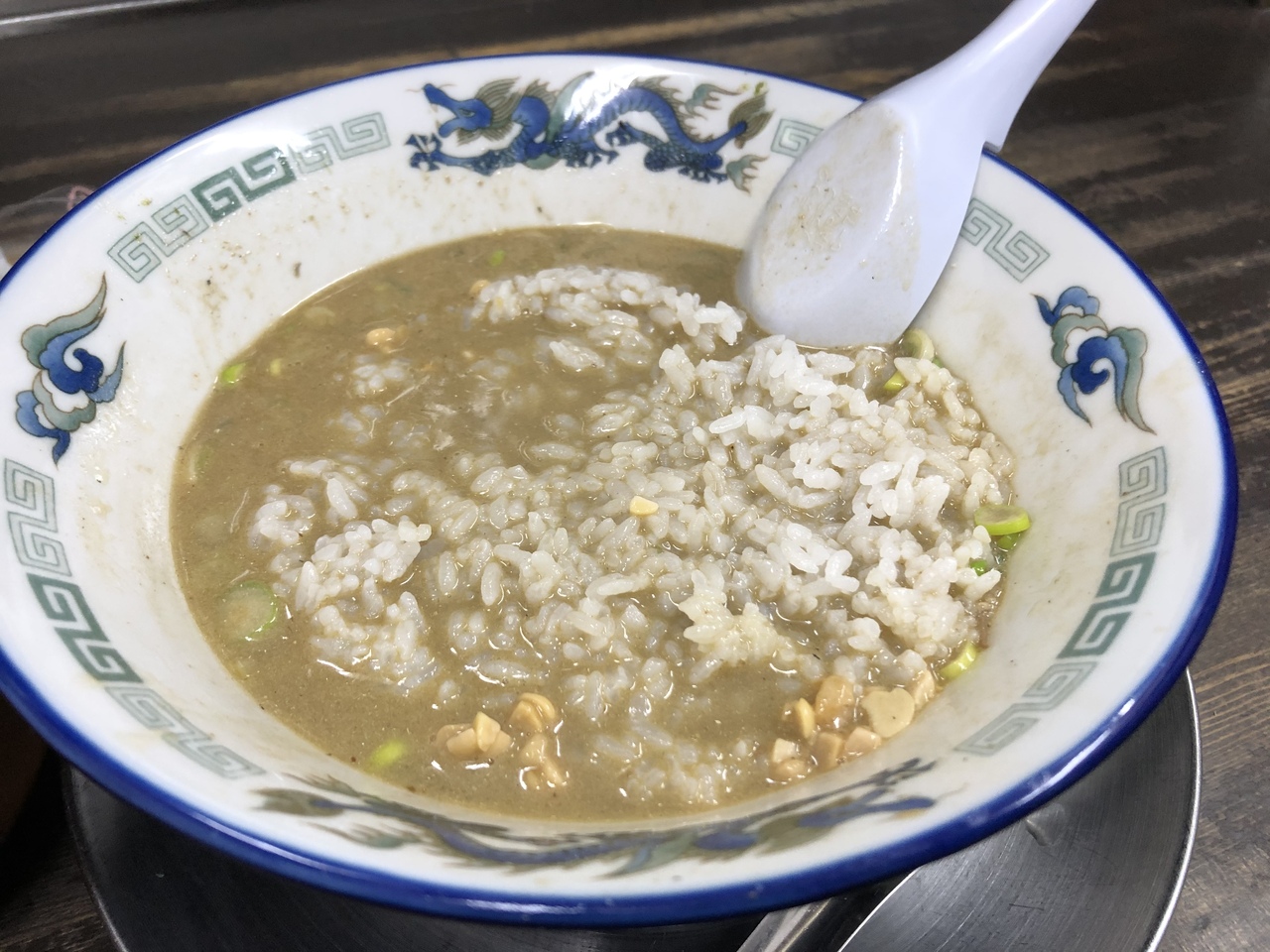 メニューは、あっさり、あっこく、こく煮干しの3つ。麺は手打ち麺、中太麺、細麺、あつさり系の場合はちぢれから選択可能。今回は、煮干しラーメンのこく煮干しのトッピング入をオーダー。少し待つこと運ばれてきた煮干しラーメンは、あまり色は良くないものの、確かにこれまで食べたことのないジャンル。麺は手打ち麺にしましたが、スープとの絡みはよい。濃厚とはいえ、豚骨ラーメンほどの濃厚さではなく、煮干しラーメンのよいところはしっかり残している印象。最後に、ご飯と納豆(量は調節した方がよい)を入れて雑炊に。見た目は残念ですが、「にぼめし」と呼ばれる雑炊は、ご飯がエキスを吸ってこれまた美味。納豆の粘りけもいい。
