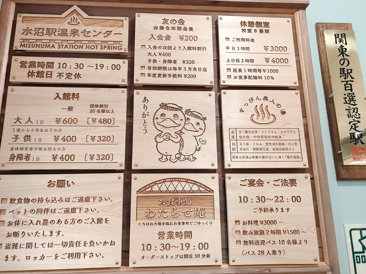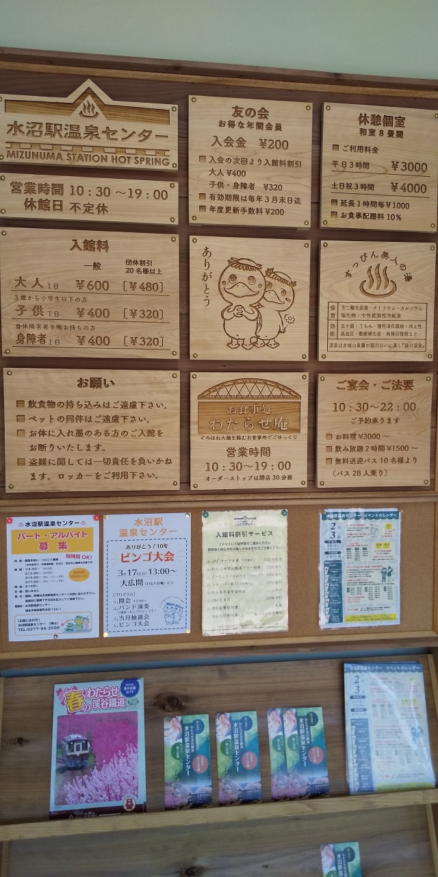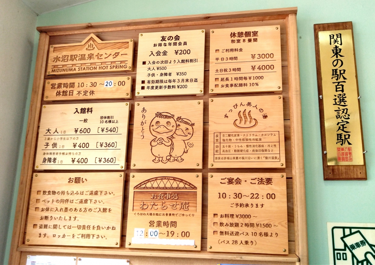 無人駅の施設で、鉄道利用者でなくても入場券は不要で利用可能。国道122号線沿いにあり、駅構内の駐車場が利用できる他、施設の反対側にも駐車場もある。入浴料は大人600円ですが、わたらせ渓谷鉄道乗り放題の「お得な一日フリーきっぷ」があれば2割引。水沼駅で降りて次の列車を待つ間に温泉を楽しむ、といった使い方も可能。