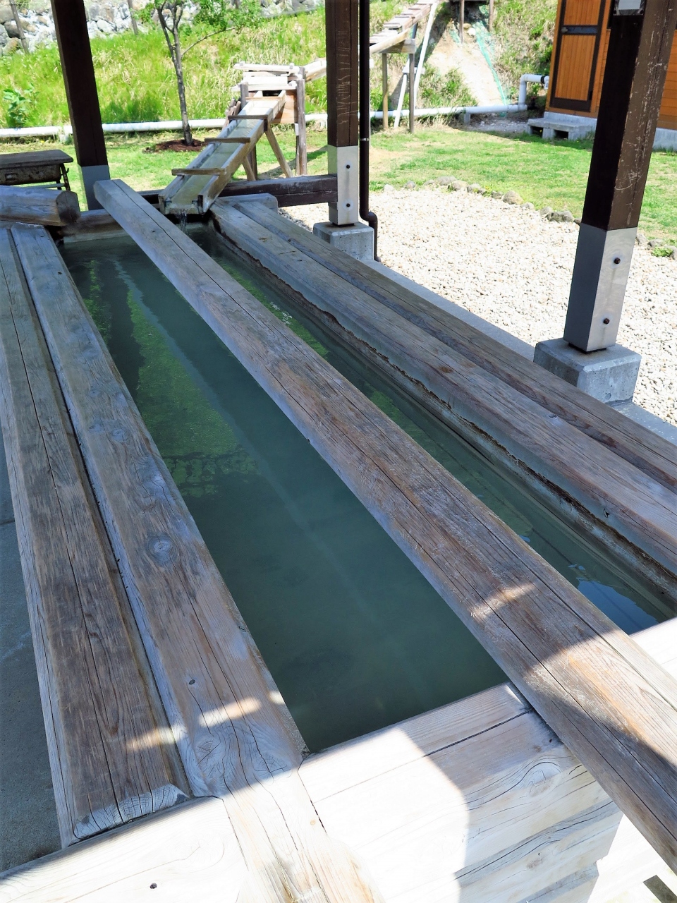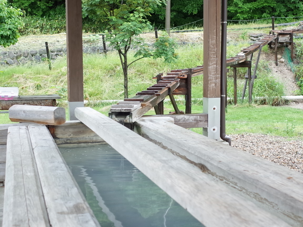 上の源泉から足湯まで、木の樋をいくつも渡り源泉が流されています。