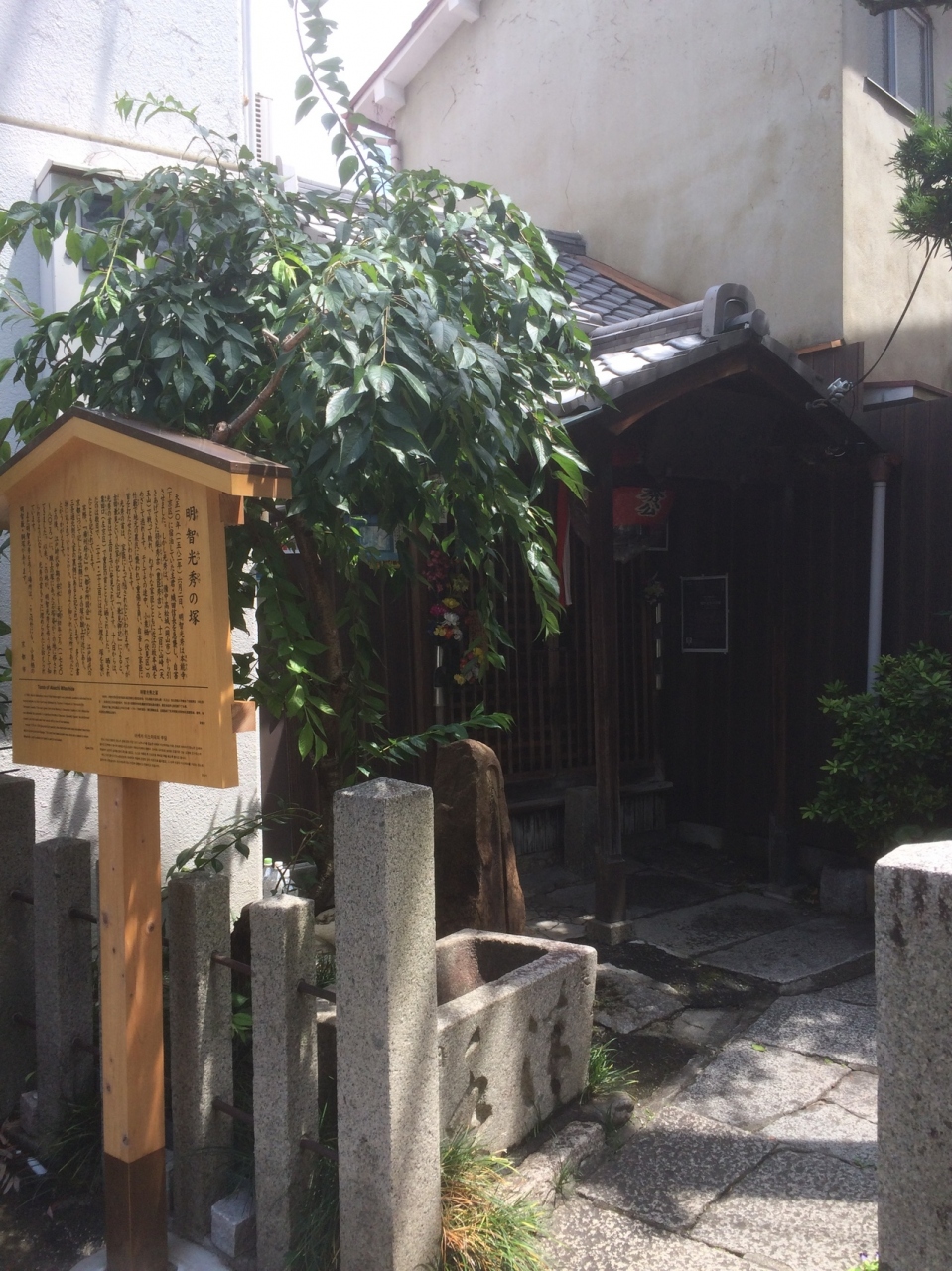 祇園祭で賑わう京都を訪れた際のこと。知恩院に寄って、スマホで観光ガイドを見てみると、明智光秀首塚というスポットがあること... 続きを読むを知りました?光秀って京都に葬むられたのかなあと思いながら、住宅街をいったりきたりするうち、白川沿いの道から路地を少し入ったところに、祠がありました。独立しておらず、家の一部のようにも見えます。格子の入った戸の中をのぞき込むと、人形のような小さな像のようなものが見えました。豊臣秀吉に敗れ逃走中に殺害された光秀の遺体の行方は諸説あるようですが、本能寺の変を引き起こした人物が、そう遠くもない場所に遺体を持ってこられるなど、悪人というこちらのイメージと当時の京都の人の評価は別物なのかもしれません、