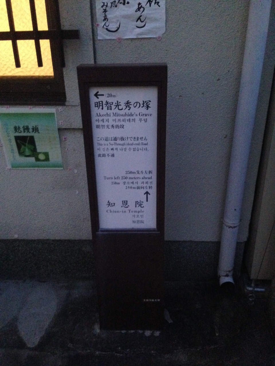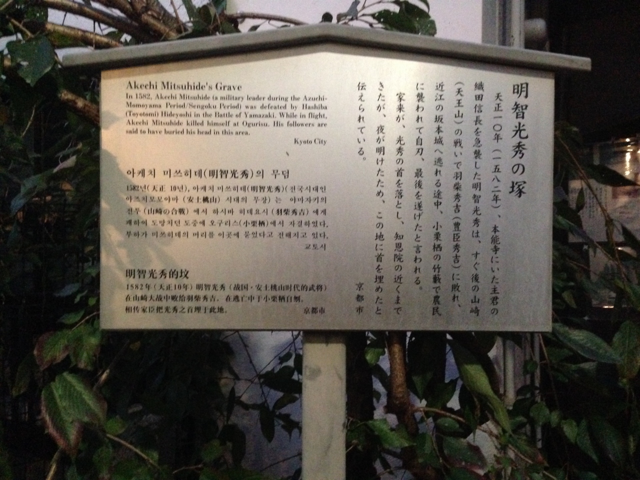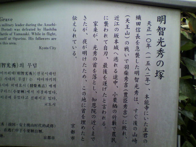 家来が、光秀の首を落とし、知恩院の近くまできたが、夜が明けたため、この地に首を埋めたと伝えられている。』 閉じる投稿日:2015/01/14