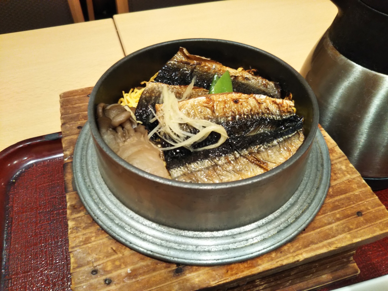 秋刀魚のほうが、秋刀魚の風味はぜんぜんなかったのが残念。美味しいと美味しくないとの中間みたいな味と食感。お茶漬けで最後しめたら美味しかった。
