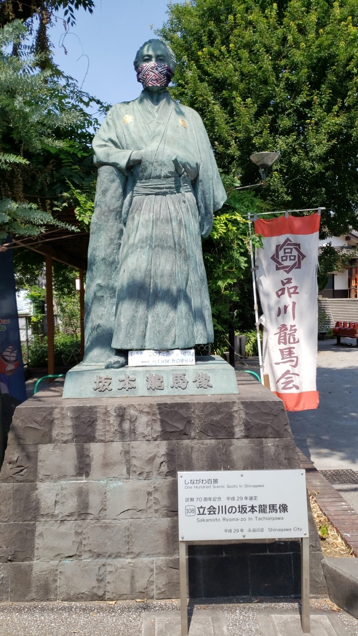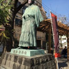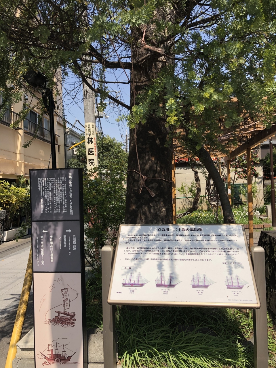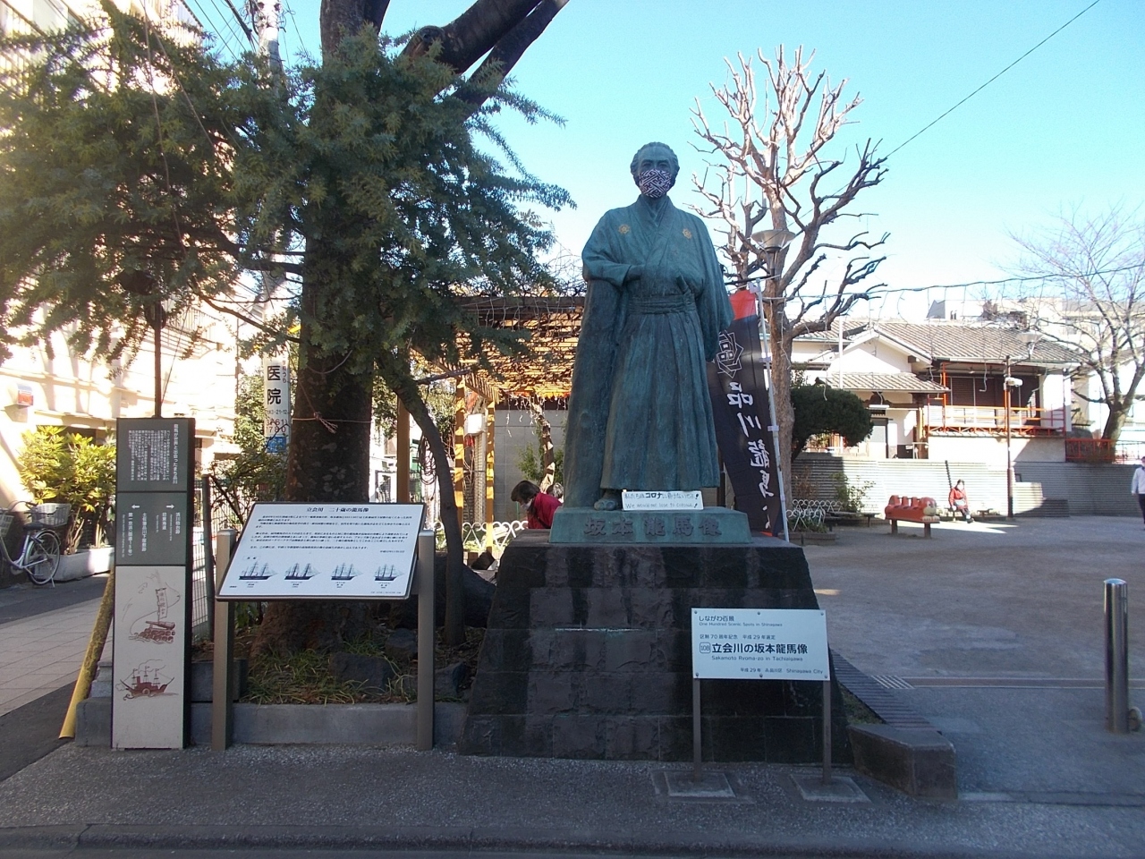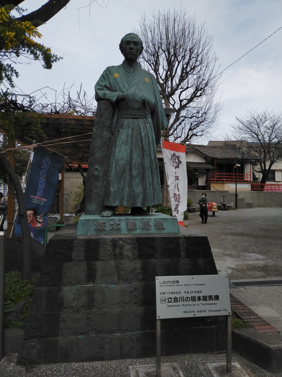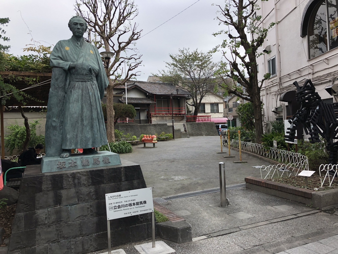 京急本線の急行電車が停車する立会川駅から徒歩1分、商店街に面する公園の入口に坂本龍馬銅像があります。旧東海道を北から歩いて... 続きを読むくると、右に行くよう看板が出ています。この公園ではよく地元の坂本龍馬商店街の方々がイベントをやっています。