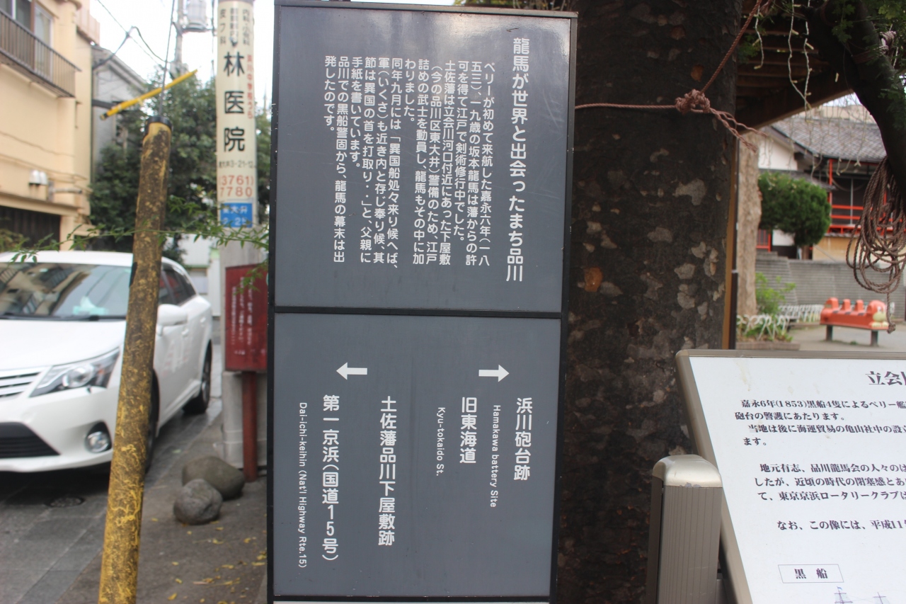 その昔、鮫洲砲屋敷が近くにあり、黒船の来航を監視するため砲台が設けられ、坂本龍馬はここで守護したとされています。今でこそ埋め立てが進んでいますが、旧東海道は当時海岸線にあたりました。