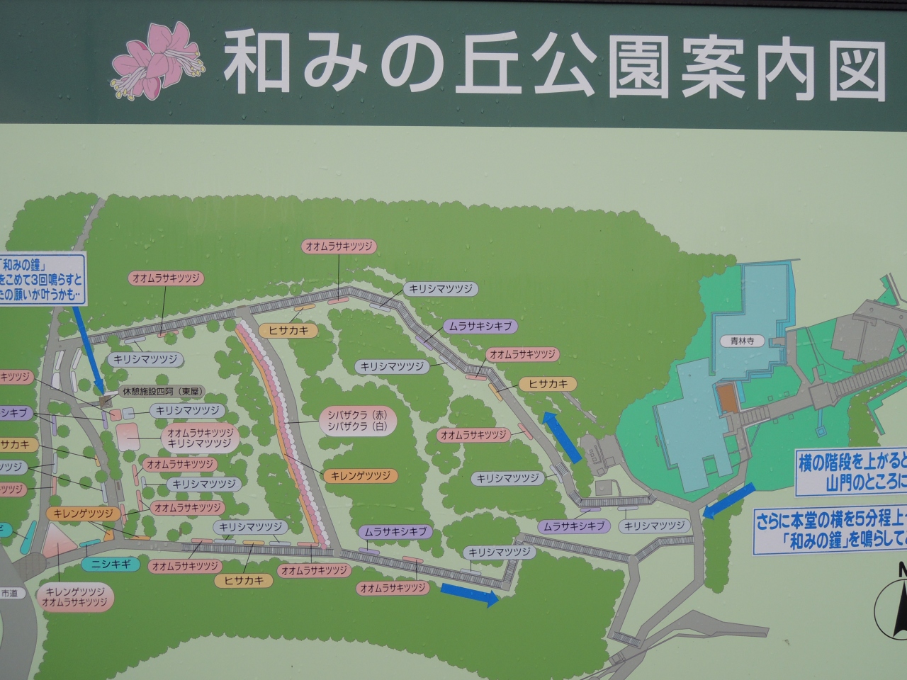 公園は、一周できるよう散策路が整備されています。公園に行かれたら、お願い事を唱えて“和みの鐘”を撞いてみて下さい。