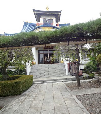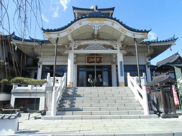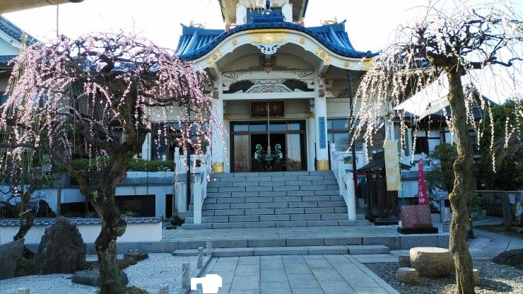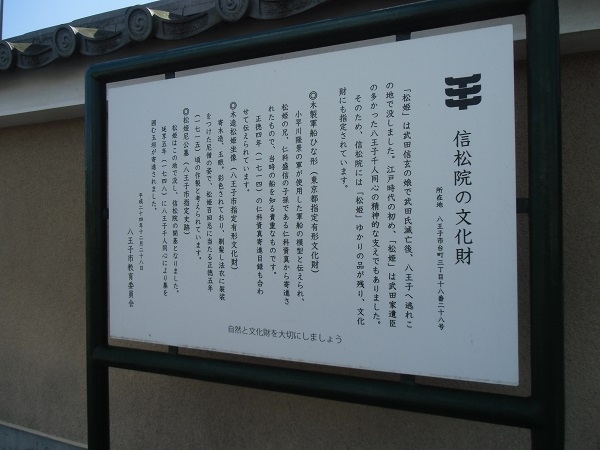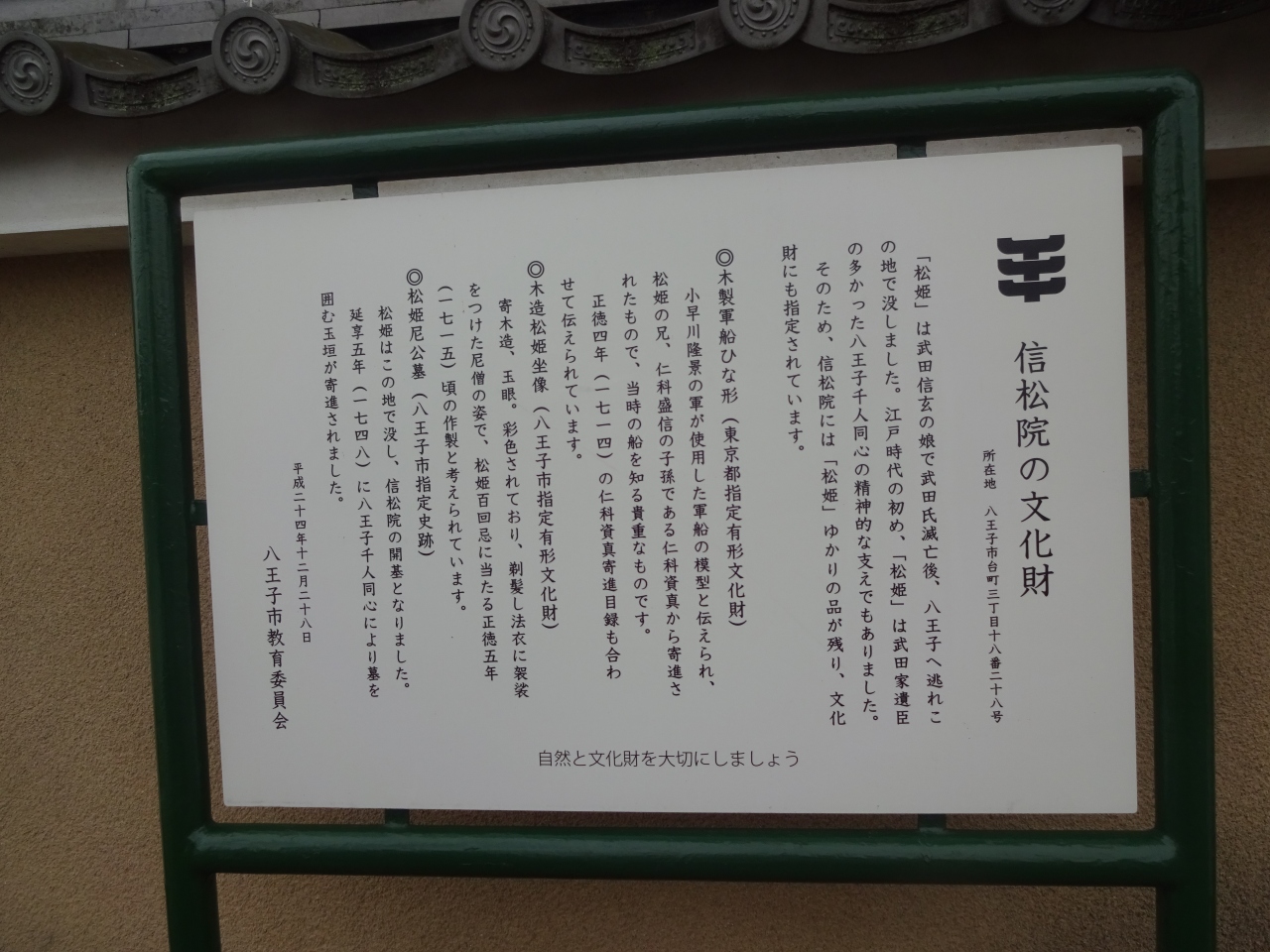 曹洞宗の一寺、開基は武田信玄の娘松姫(信松尼)、開山はト山舜越。松姫が心源院で出家した後、1590年、心源院から八王子御所... 続きを読む水に草庵を移したのが始まりです。文化財は木造松姫坐像、軍船ひな形等を有します。本堂(観音堂)の上に舎利殿(仏塔)、日本の仏教寺院では見たことが無いちょっと変わったイメージの屋根の青が目をひく建物です。観音堂の地下には布袋尊が祀られ、八王子七福神の一つになっています。また早咲きの桜、開花初めのシダレ桜がきれいでした。訪れる価値のある寺院です