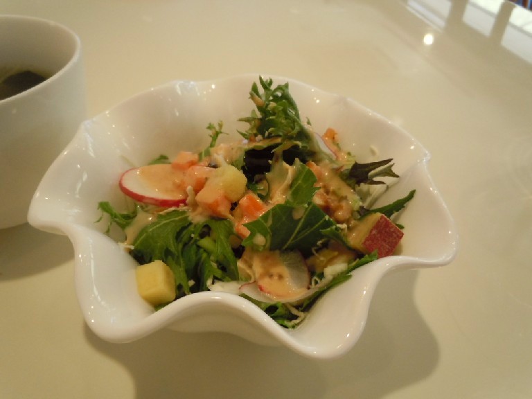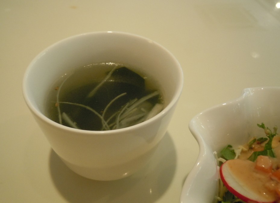 料理はランチに付くサラダとスープ(韓国風わかめスープ)がテーブルに運ばれる!