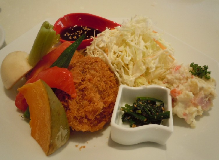 メンチカツの直径は小ぶりだが厚みがあり2個入り!付け合せの野菜はたっぷり千切りキャベツに加えカブ、ニンジン、オクラなどの野菜が皿に彩を加えている!