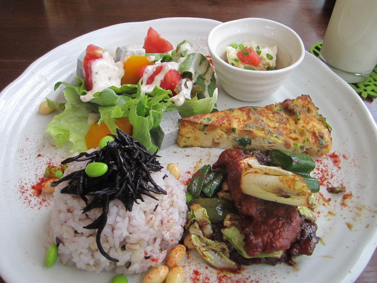 桐生駅から歩いて10分強、東小学校の南側にある大豆を使ったヘルシーカフェです。同じ建物のお隣には豆腐屋さんが併設されており... 続きを読む(というよりも、お豆腐屋さんがカフェを経営しているというべきでしょうか)、豆乳や寄せ豆腐といった料理が新鮮なのもむべなるかなといったところです。大半の食材が植物性なので低カロリーですが、咀嚼をしっかりしないといけないような料理なので(不思議と硬くて食べにくいということはありません)、満腹感が得られます。健康的で美味しい料理を頂きたい方は是非どうぞ。 閉じる