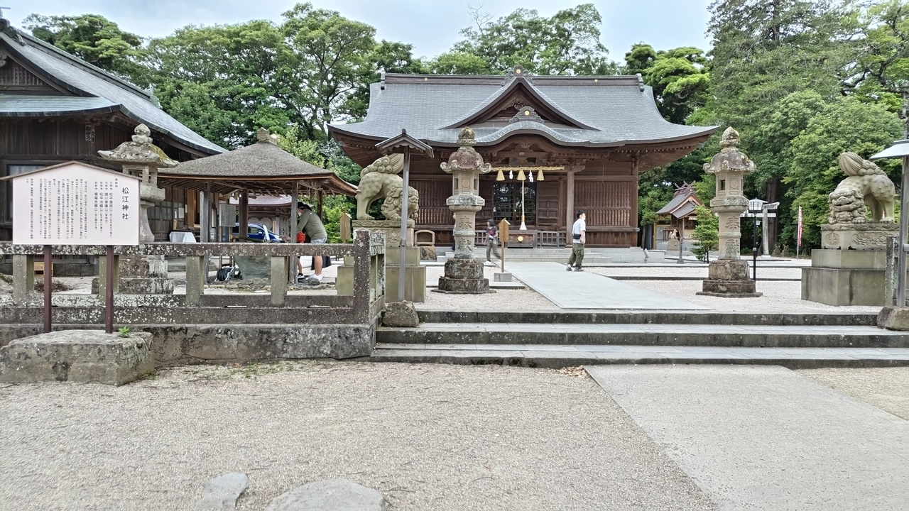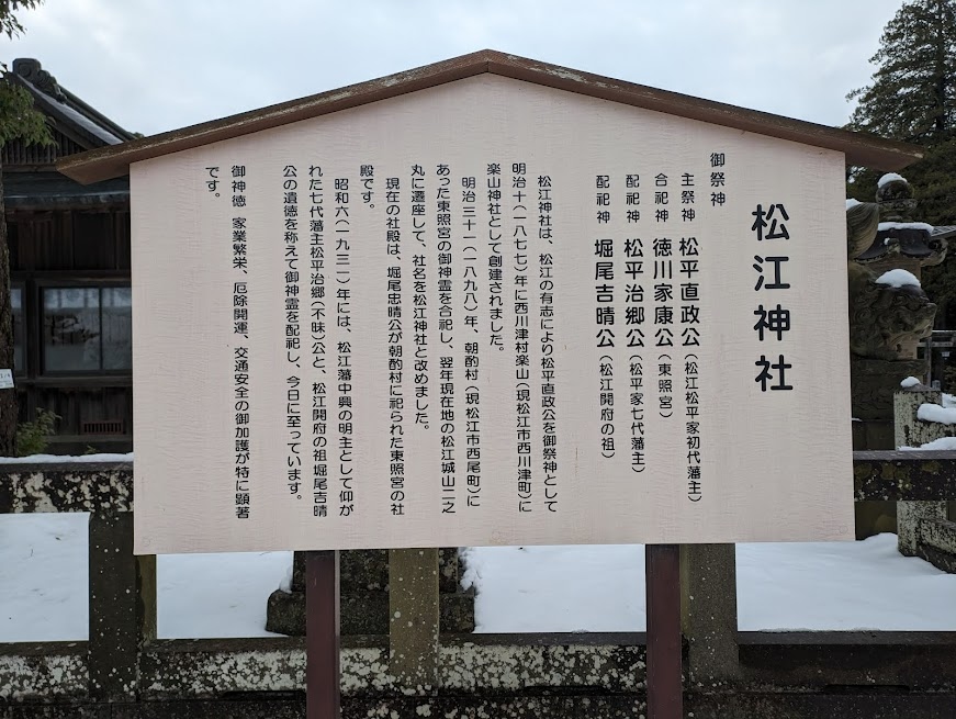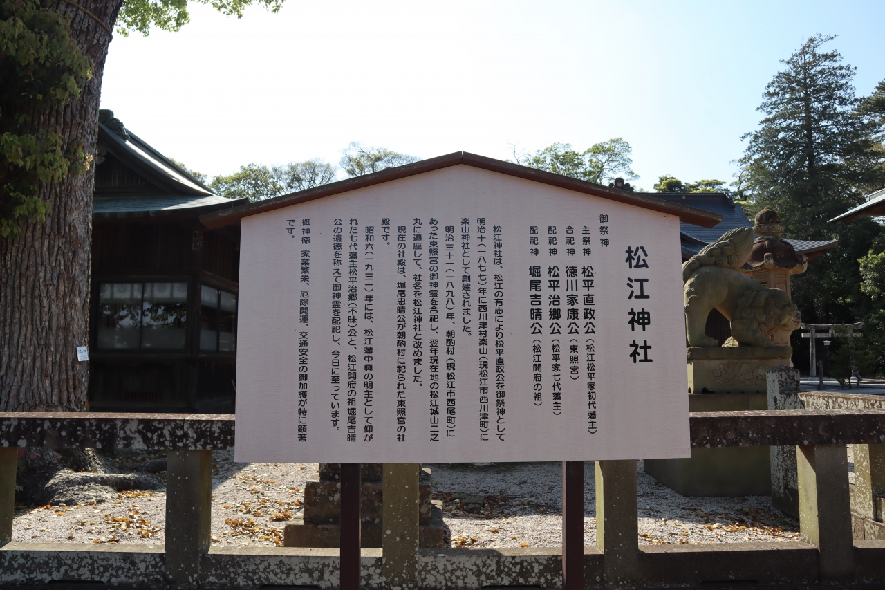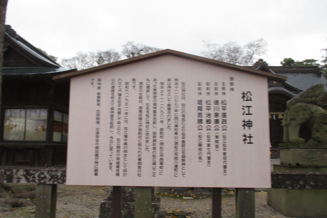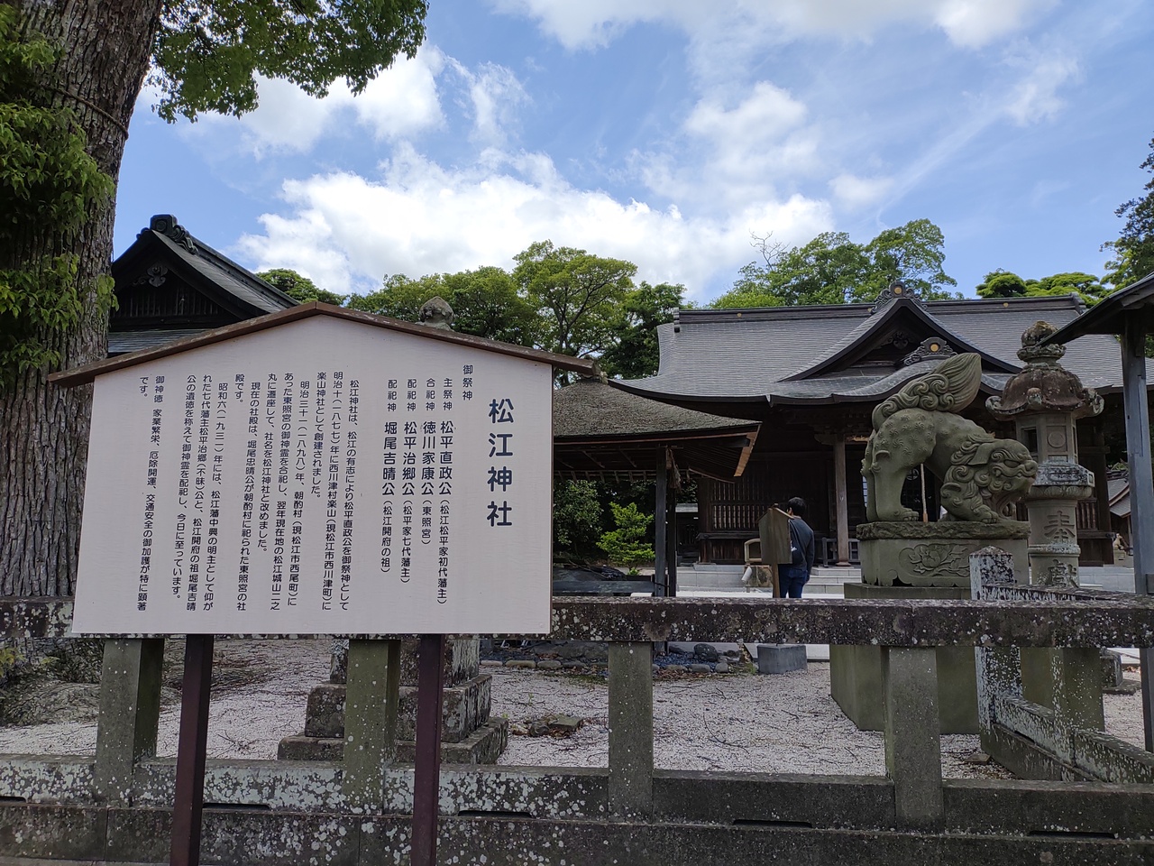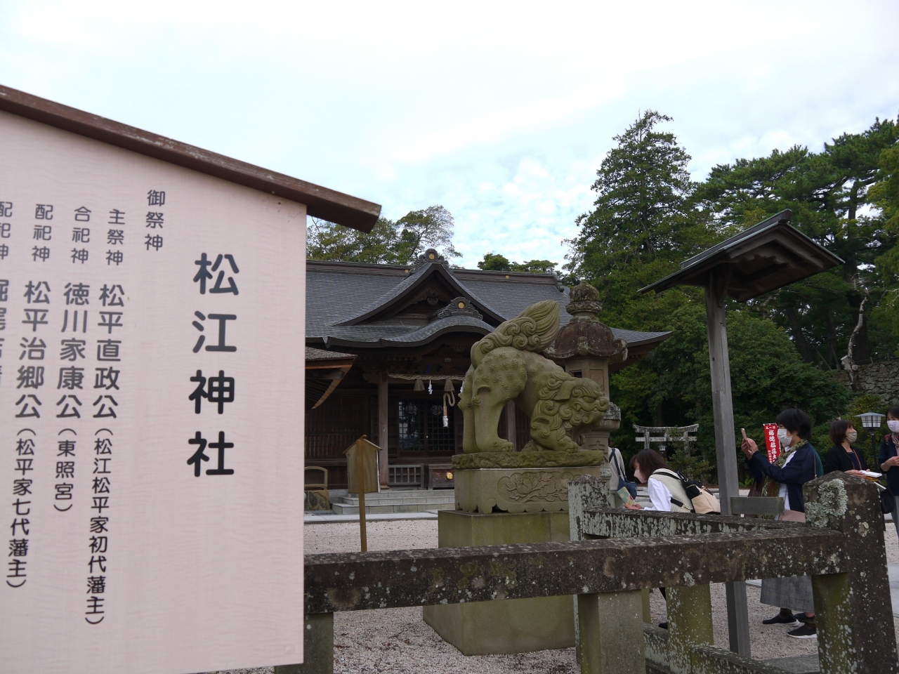 松江城の二の丸跡に、松江神社と興雲閣がありました。松江神社のご祭神は4柱で、主祭神は松平直政(松江松平家初代藩主)で、合祀... 続きを読む神は徳川家康、配祀神は松平治郷(松平家7代藩主:不昧公)と堀尾吉晴(松江開府の祖)です。松江神社の前身となる楽山神社は、祭神を松平直政として1877年(明治10年)に創建されています。現在地には1899年(明治32年)に遷宮され、社号を松江神社と改めています。