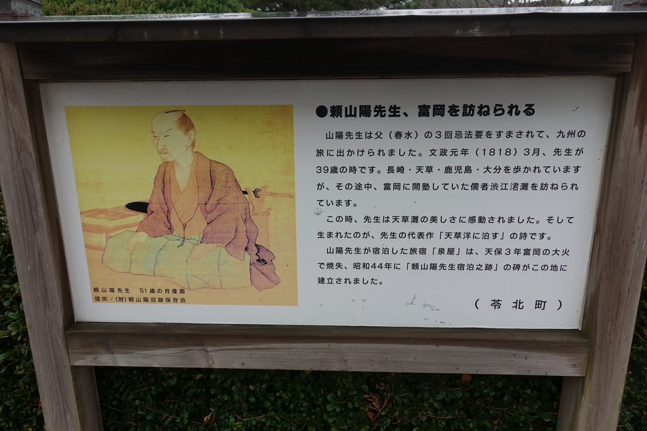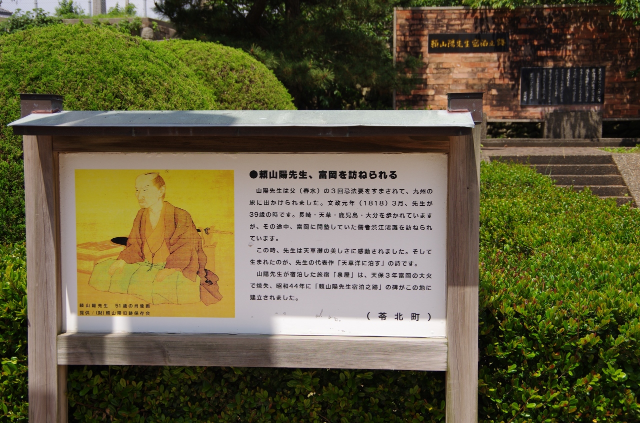 富岡小学校の入口となる坂道の横に、頼山陽先生宿泊之跡と刻まれた祈念碑がありました。何といっても宿泊の跡ですからちょっと呆れ... 続きを読むる感じがしました。頼山陽さんは頼山陽公園とともに、富岡では格別な扱いのようです。何と云っても、名吟「泊天草洋」を生んだ場所ですからね。頼山陽が1818年(文政元年)39歳の時、この富岡に開塾していた儒者・渋江龍淵を訪ねています。その時に宿泊したのは旅籠「泉屋」だったとのことです。その泉屋は、1832年(天保3年)の富岡の大火で焼失してしまいました。1969(昭和44年)に、その跡地にこの碑が建てられたのだそうです。なお、この大火の年に頼山陽は亡くなっています。 閉じる