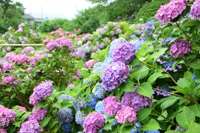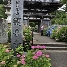 無料駐車場があります。ここの紫陽花の本数がハンパない。圧倒されちゃいますよ。 あー、もうここ(入口)だけで十分だわ。なんて思っていたんだけれど。 門の向こうには、両脇を紫陽花で埋め尽くされた小路が続いているのが見えて。こちらのお寺、とにかく紫陽花の本数は圧巻ですね。