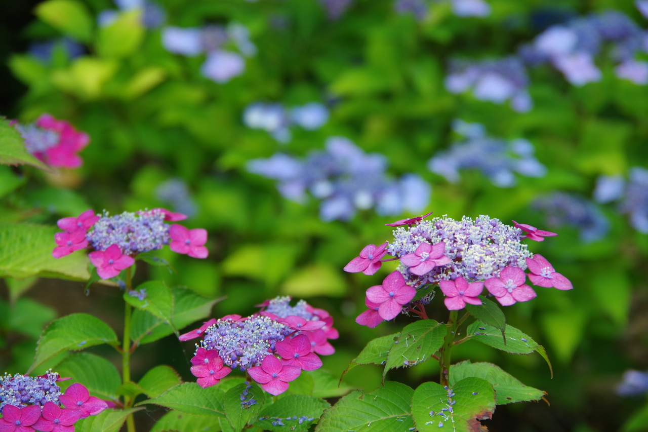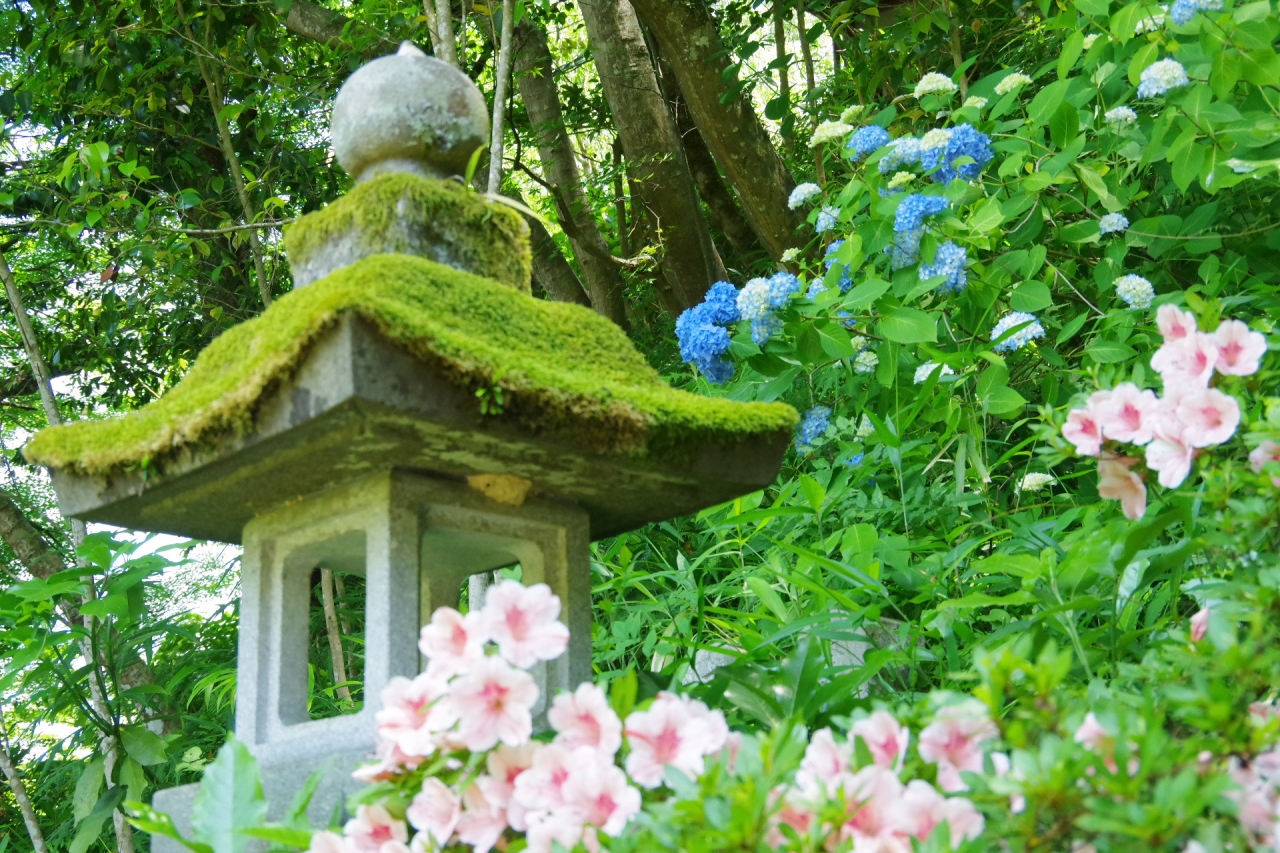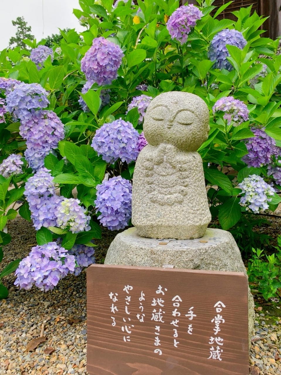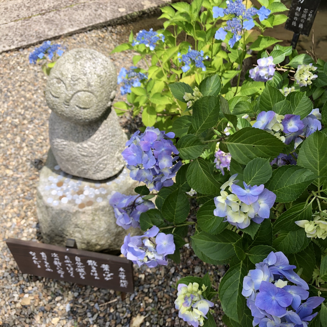 境内に何体かある、わらべ仏というかわいらしいお顔をしたお地蔵さんとあじさいを一緒に撮影すると、心が優しくなりました。 奥池のエリアにはちょっと珍しい品種のあじさいも咲いています。
