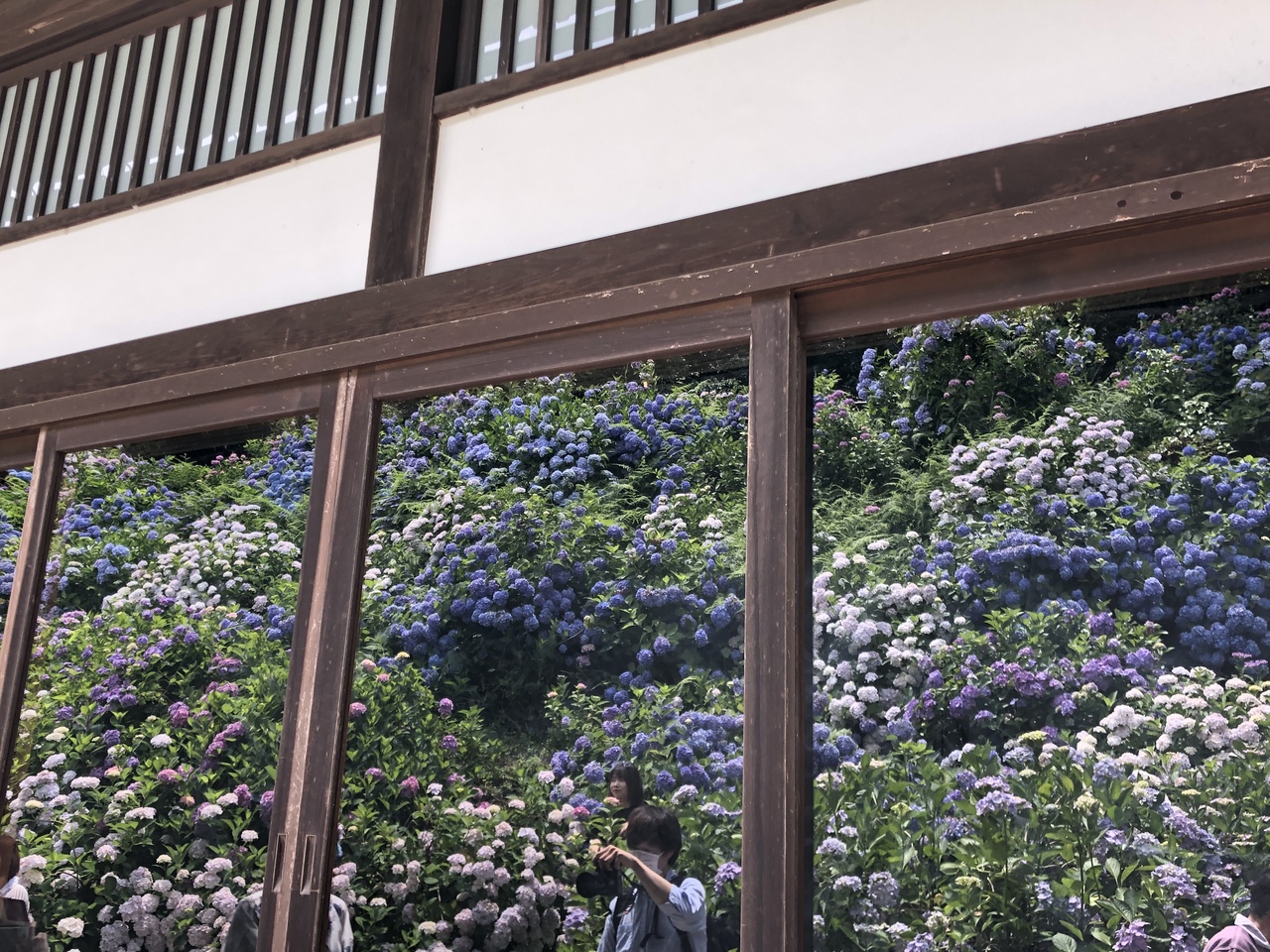御堂の先は万本ほどもある紫陽花の光景に圧倒されました。また、それを写し込む様子が見られるように御堂の内ガラスに暗幕が張られているのが素晴らしいです。