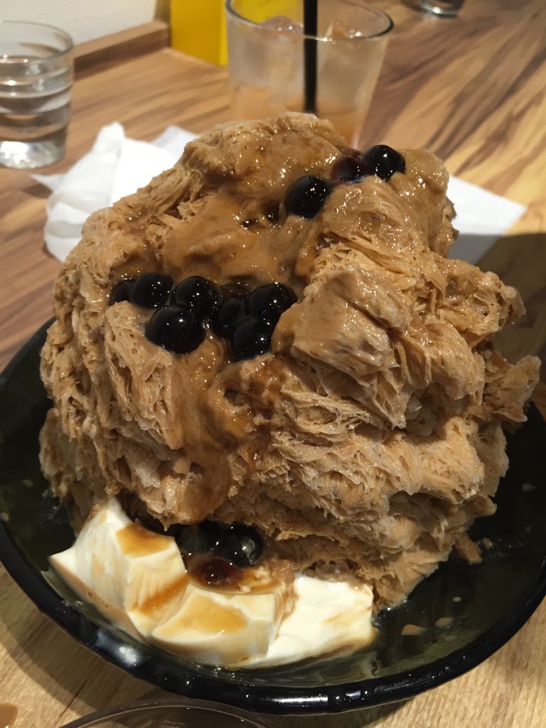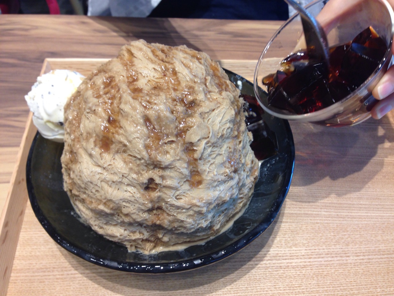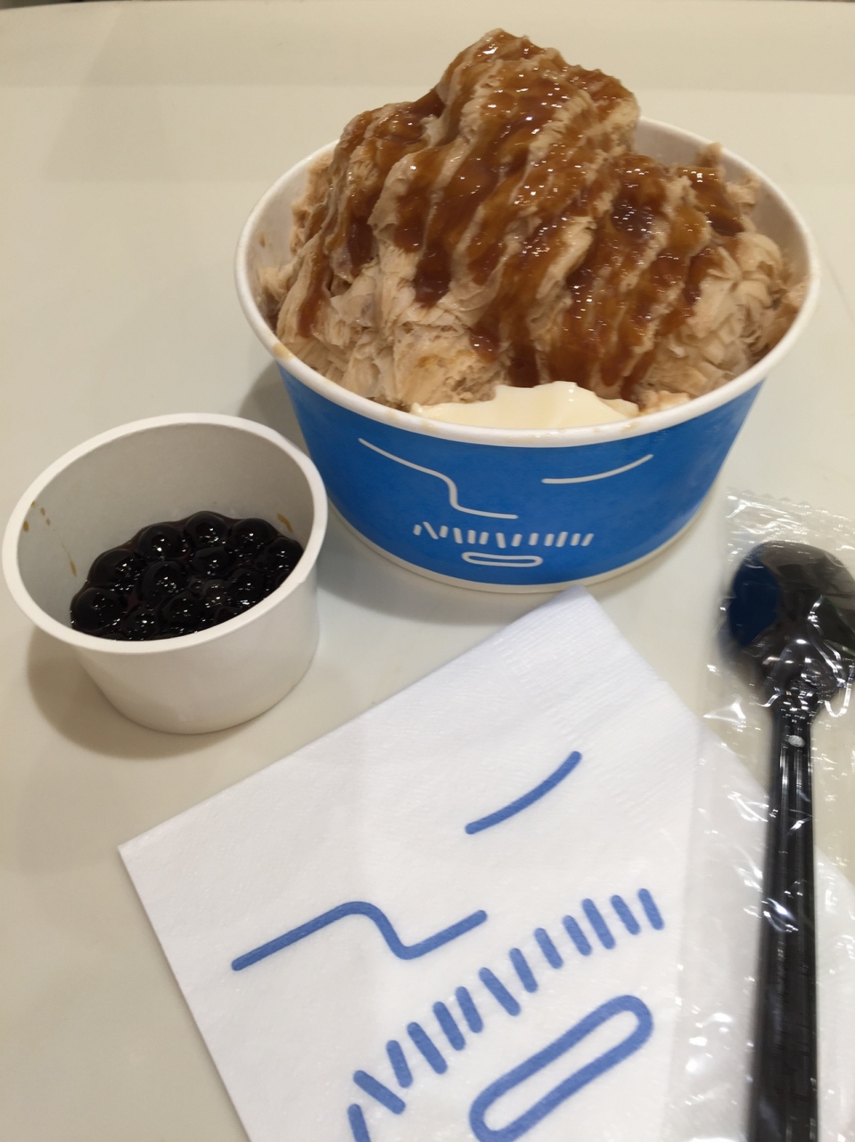 ホームページで見た時から「かき氷には見えないな」と思っていましたが、食べてびっくり。とてもフワフワした食感で今までのかき氷のイメージが覆されました。このかき氷の良いところは全体に味がしみ込んでいるため、外側だけ甘くて中は氷ということがありません。温かいタピオカを少しずつかけながらとても美味しくいただきました。