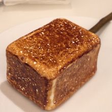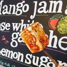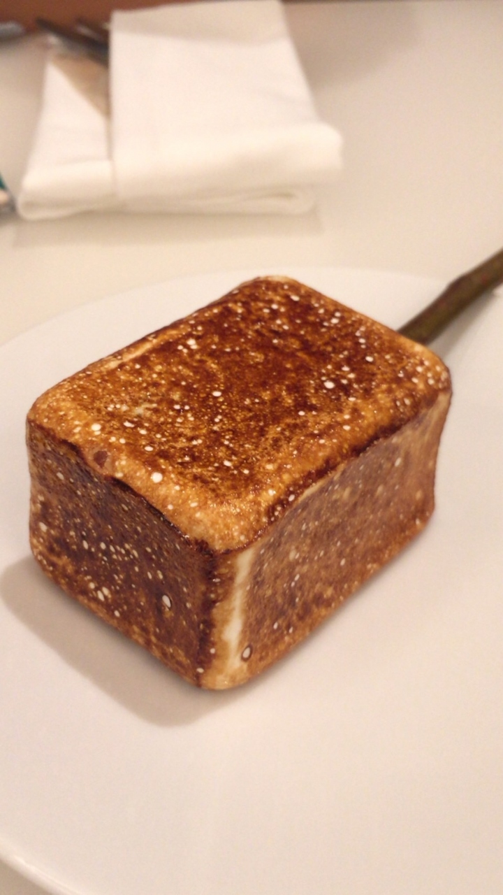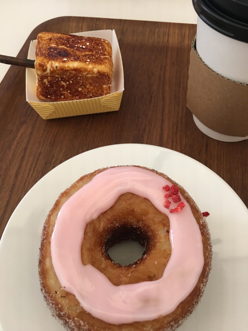 DKA(ディーケーエー「ドミニクのクイニーアマン」)とFROZEN S'MORE(フローズンスモア)とドリンクを注文。DKAやクロナッツは店内で食べても持ち帰りでも半分に切ってもらえます。店頭で作るスイーツ・フローズンスモアは中がアイスクリームで外側が四角いマシュマロをバーナーの炎で焼くもの・・マシュマロを焼いたら、粘りが出て、不思議な食感で美味しい。