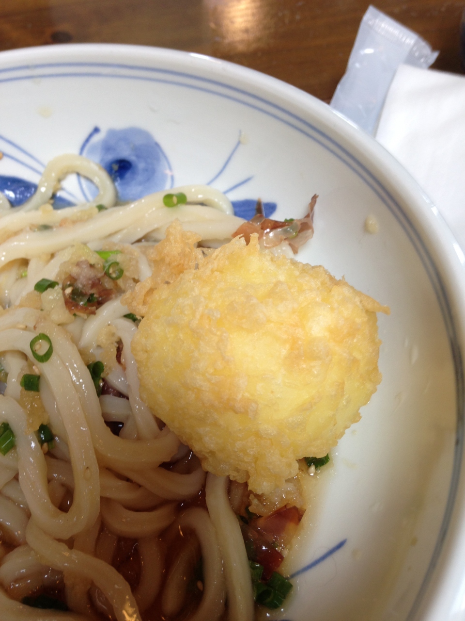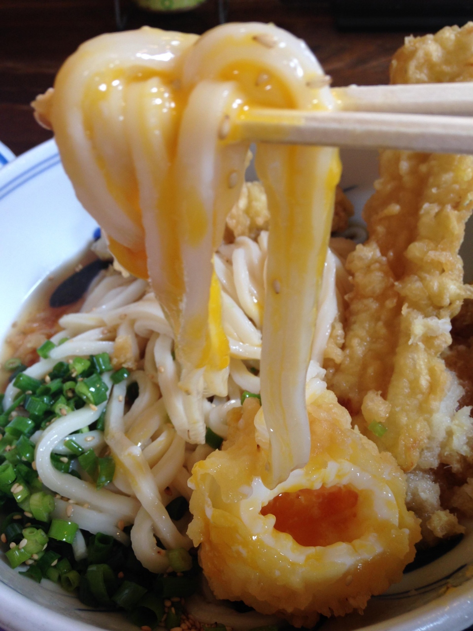 メインのうどん、一品料理としてのエビ天と半熟卵