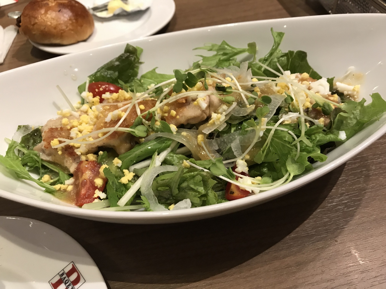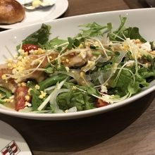 いつもの焼き立てパンの食べ放題付き、ドリンクバー付きという感じで、料理はチキンサラダを戴きました。