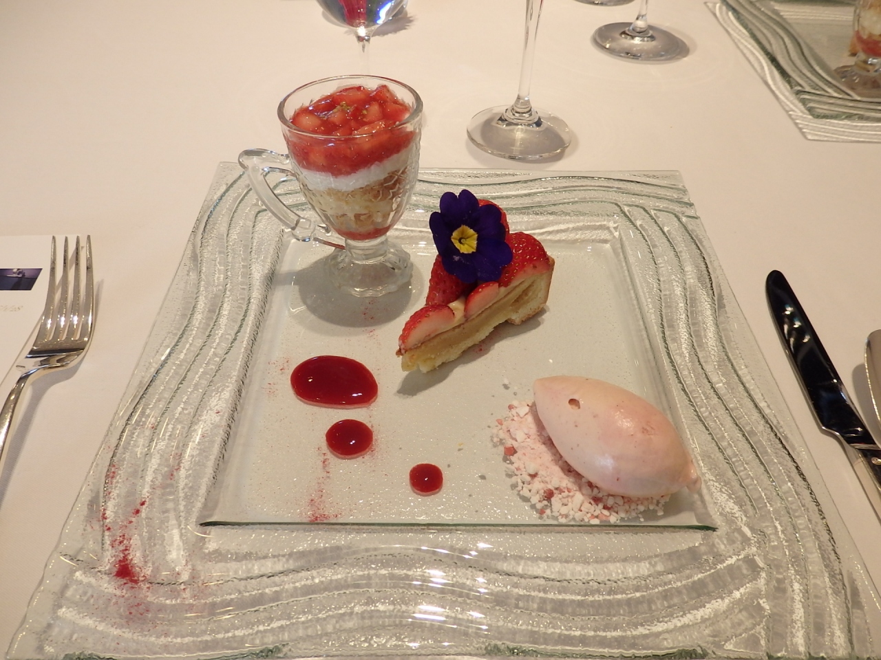 コースのお料理は美味しかったのですが、私個人的にはちょっ... 続きを読むと味が薄いかな?と感じました。イチゴづくしのデザートはどれもとても美味しかったです。