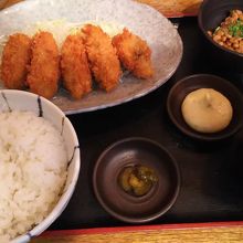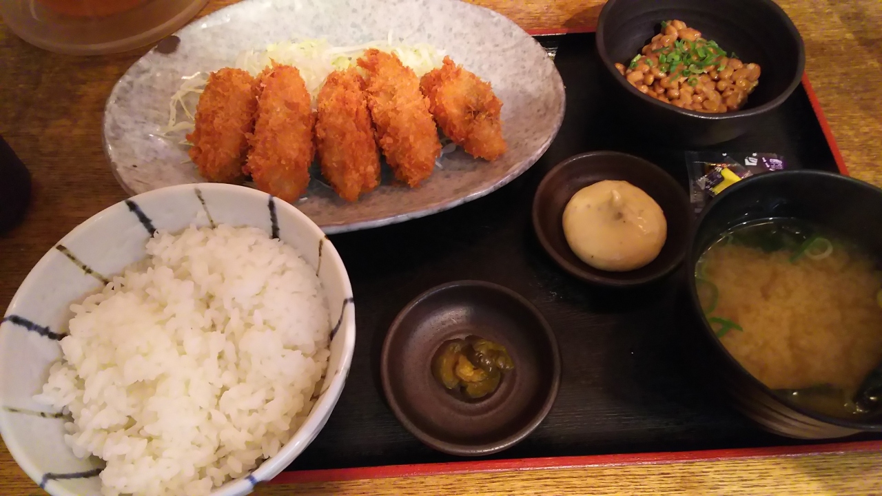 オーダーは食券式。フェア価格790円→750円のカキフライ定食と納豆100円を階段を下りた入口前の券売機で購入する。ご飯は大盛り、おかわり自由。この店の先にあるご飯おかわり自由の某定食チェーンは1000円だからおトク。しかもY軒は4個のカキフライが5個ついてきた。おかわりもできるしボリューム十分だ。