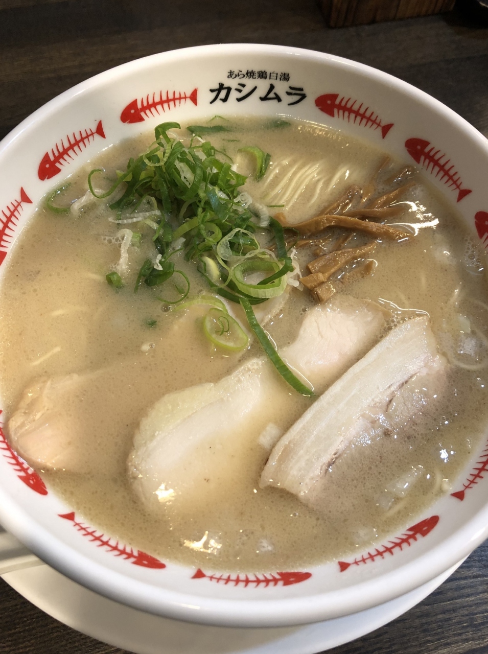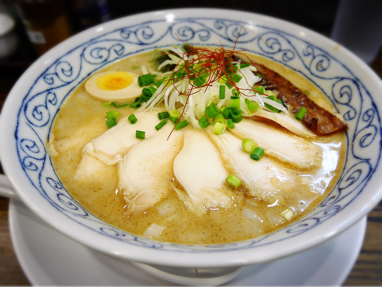 見た目は、通常よりもドロッとしたスープに、鶏チャーシュー、白髪葱、小口葱、玉子(半分)、焼かれた筍、生海苔等がトッピングされています。。
