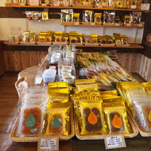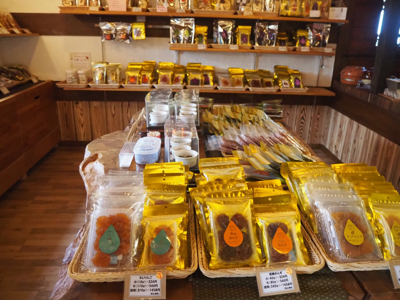 新しいログハウス風のおしゃれな建物の中には様々なドライフルーツが並びます。