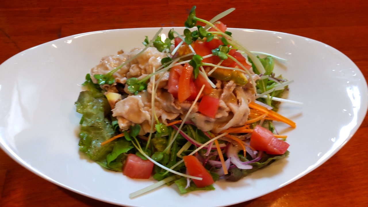 なので、餃子の中のハンバーグの風味や味がボロネーゼの強すぎる味に吸収されていて、なんだかよくわからない感じでした。 豚しゃぶはトマトの酸味、豚肉の素直な甘味がゴマドレッシングの辛さと旨くシェアしていてとても美味しかったです。 パスタも辛めでした。ムール貝のあのきわどい風味と味(攻めすぎると臭みになるヤツ)も辛めのオリーブ油でさっぱりでした。