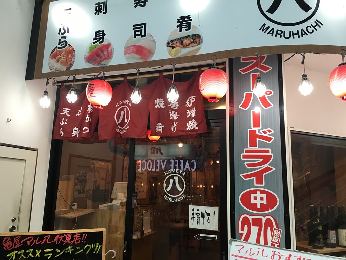 京都伏見の大手筋商店街にある「亀屋マル八 伏見桃山店」です。左隣りには同じような大衆居酒屋の「大阪満マル」がありお互いマル... 続きを読むマルで競り合っているように並んでいます。どちらも同じ雰囲気ですが今回はここ亀屋マル八に入ってみました。