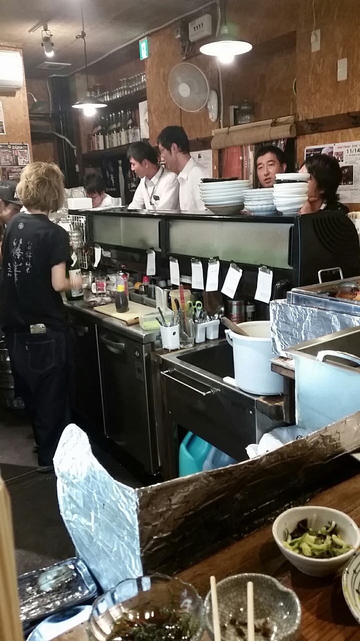 なお、この店はいつも常連客で流行っています。中のカウンターもほぼ満席で、空きがあればラッキーという感じです。今回、我々が入ったときは、先客がちょうどお勘定していたときだったんですんなり入ることができました。
