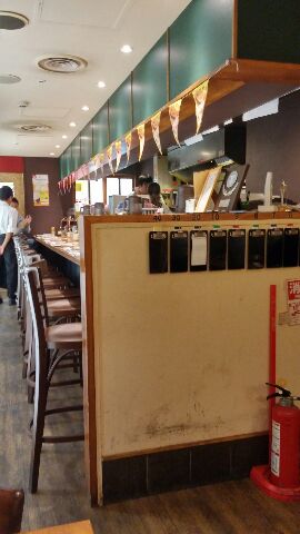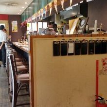 カウンターに小皿が積んであり、色んなソースやスパイスで楽しめます。
