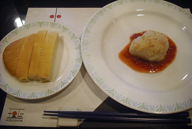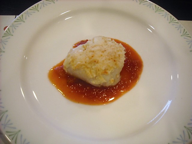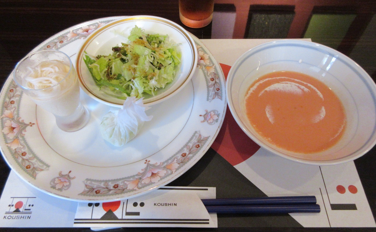 月替わりランチの冷製トマトスープや魚と肉料理をいただきました。