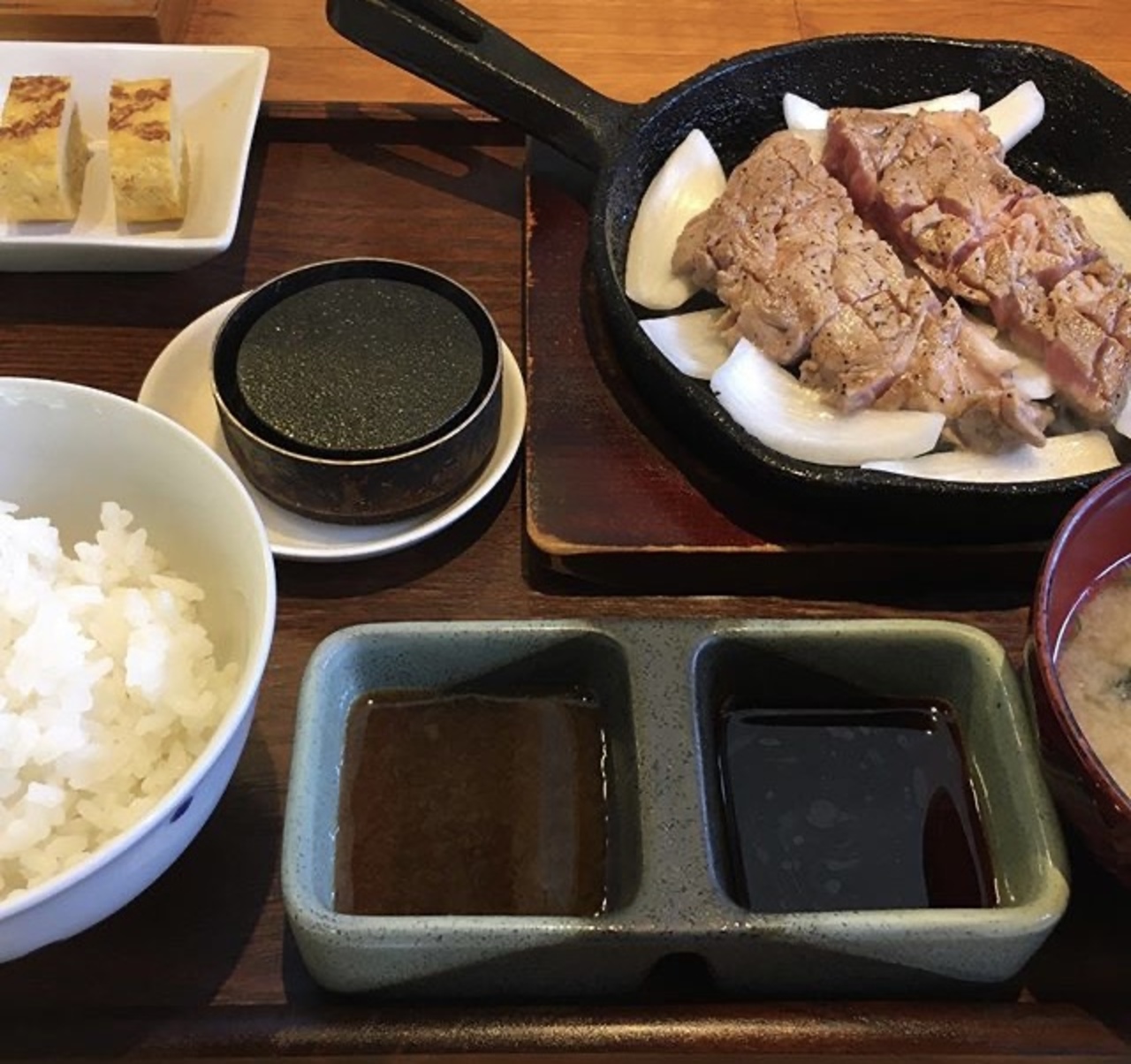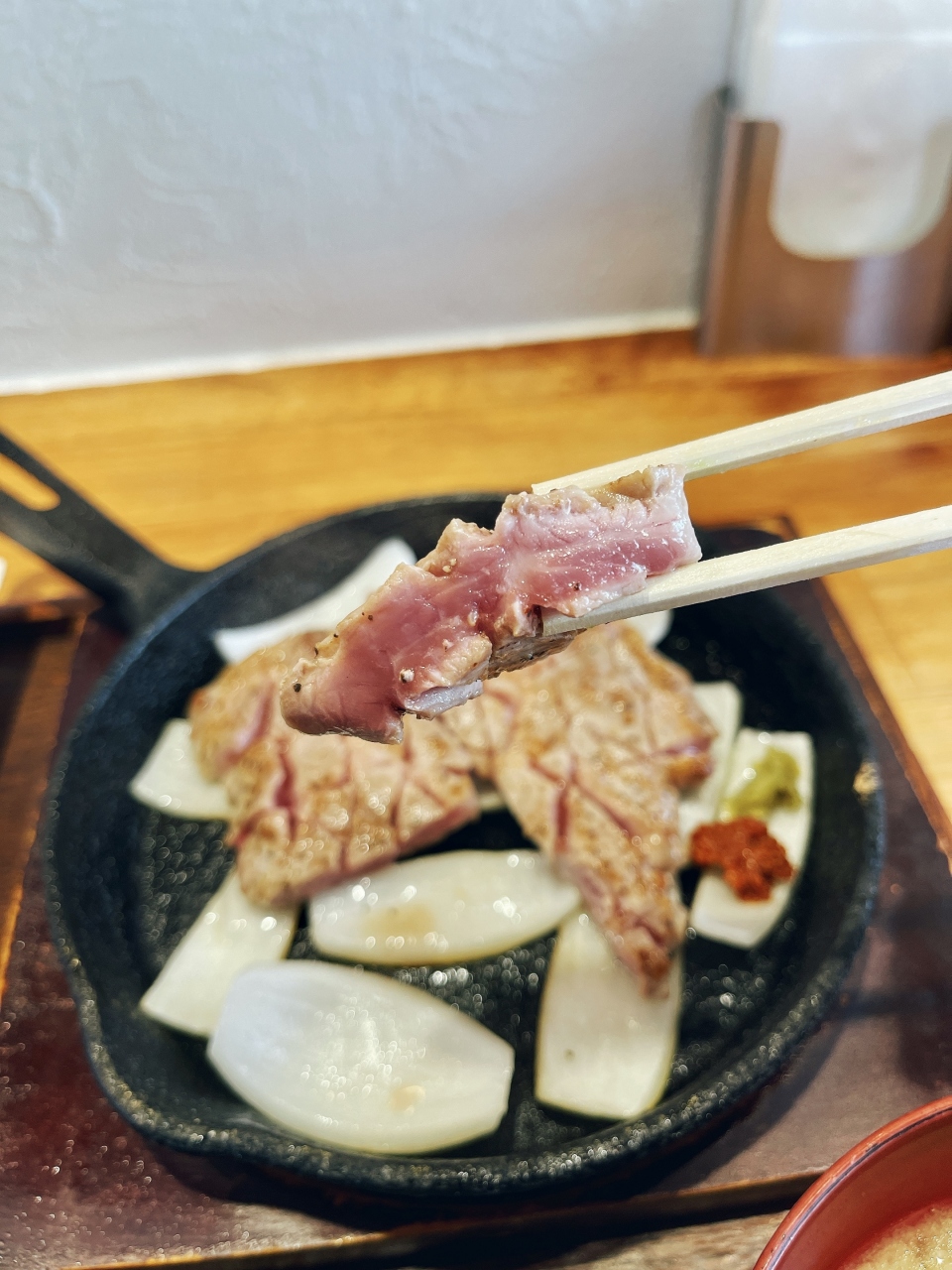 レアな状態の肉が苦手な方は自分好みに合わせて焼き石で焼きながら食すといいでしょう〜ただ焼き過ぎるとこのお肉の良さがなくなるので要注意です!甘めのステーキソースと辛口のしょうゆダレに「ゆずこしょう」「ワサビ」「自家製辛みそ」などの薬味とマリアージュさせ頂くのも美味しい〜いろんな食べ方が楽しめるけど「ゆず&辛味噌」と一緒に食すのが気に入ったかな!「トンテキ」「豚ステーキ」好きには堪らないお店でした。