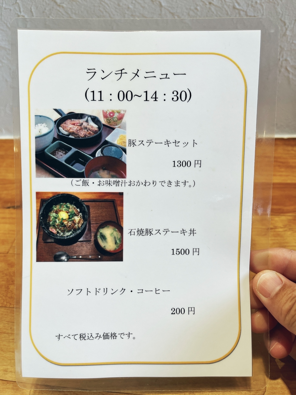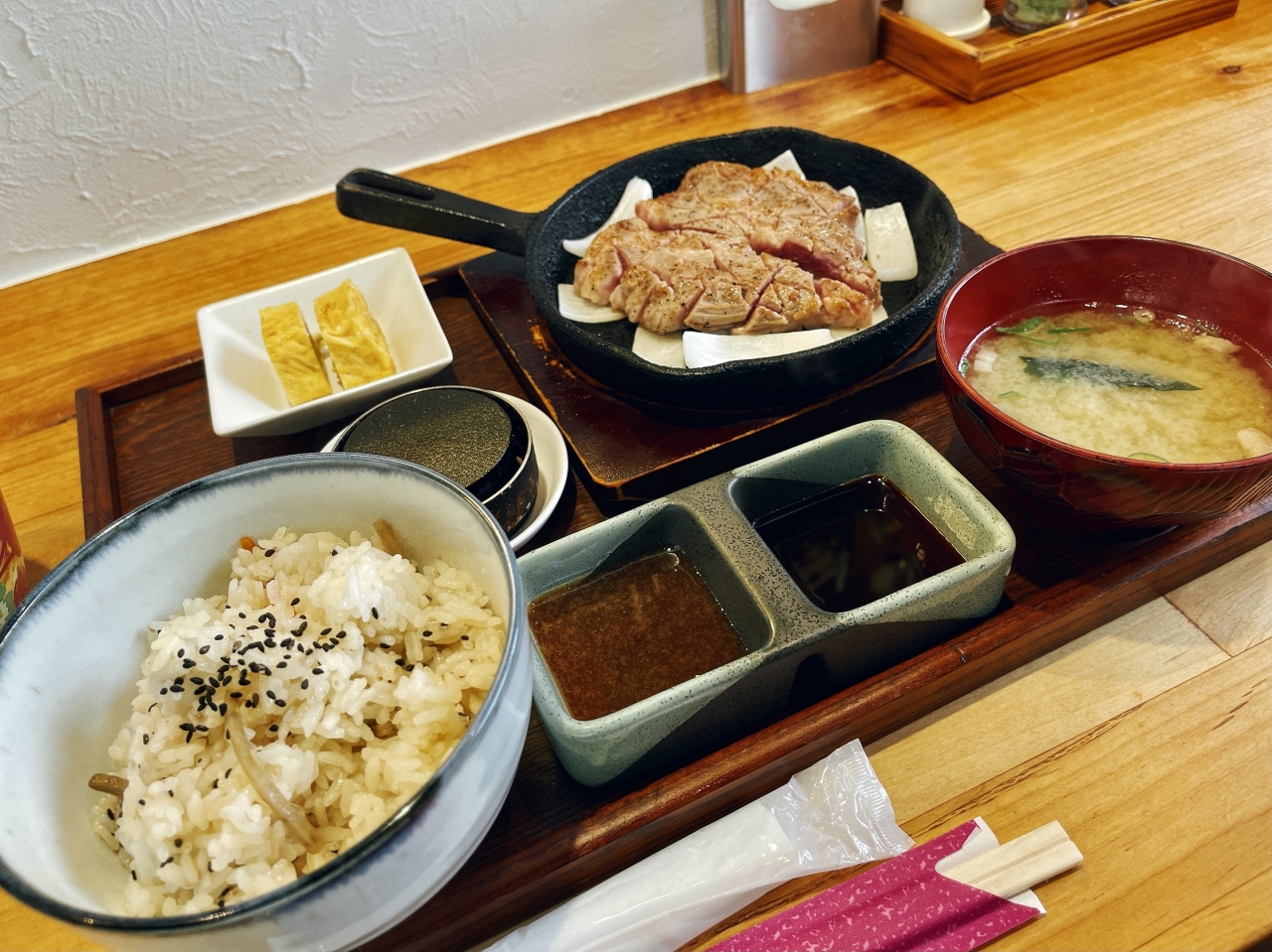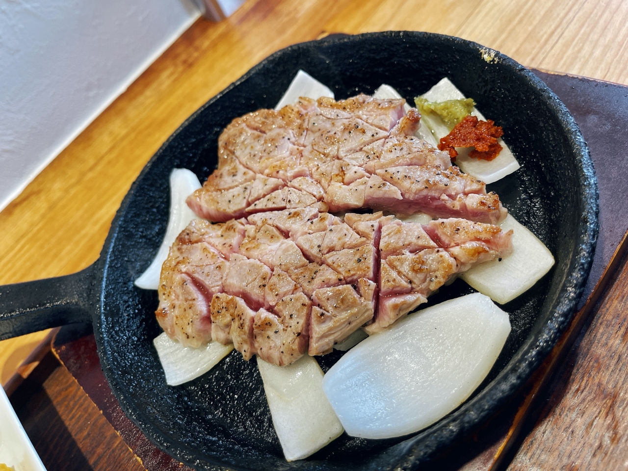 ランチ「豚ステーキセット」「石焼豚ステーキ丼」の2択!頂いたのは「豚ステーキセット」〜先ずはアボガドが乗ったサラダが配膳され〜待つこと7分くらいしてから「豚ステーキ」がジュージューと音をたてながらスキレット鉄板の玉ねぎを寝床に配膳されてきた!「豚ステーキ」には予め包丁がランダムに入れられその合間からピンク色したレア感がアピールしてくる〜先ずは何も付けずにパクリと!おっ美味い〜柔らかい肉質!脂などひつこくなくヘルシーな部位なのか「豚ステーキ十一」よりあっさりとしています!ヘルシー思考な女性にオススメかもね。